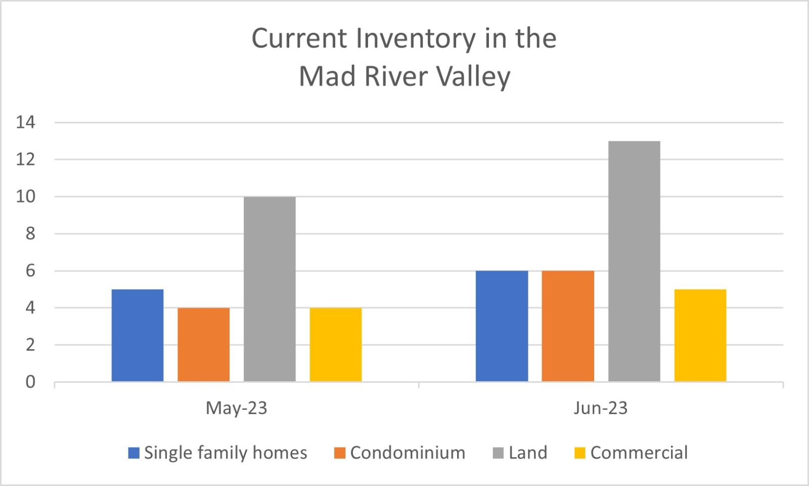 The current inventory in the Mad River Valley is “up” to 6 single family homes (5 this time last month), whole-ownership condos are up to 6 (4 this time last month), there are 13 undeveloped land parcels (10 this time last month), and 5 commercial properties (4 last month). That is 30 active listings across all sectors, 23 this time last month. In contrast, in the past calendar year there have been 69 single family home sales, 66 condo sales, and 20 land sales.