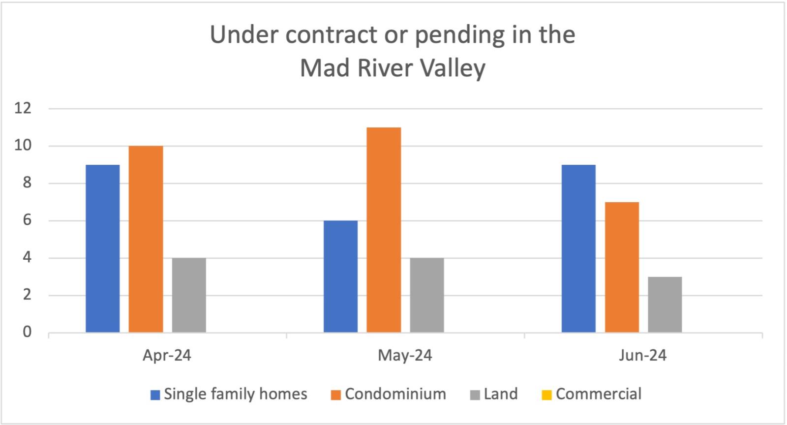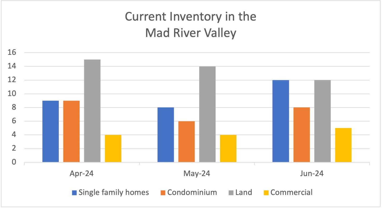 The current inventory in the Mad River Valley is up to 12 single family homes (8 this time last month), whole-ownership condominiums are up to 8 (6 this time last month), there are 12 undeveloped land parcels (14 this time last month), and 5 commercial properties (4 last month as well). Overall, a slight rise in inventory, and we should see more as we get into July.