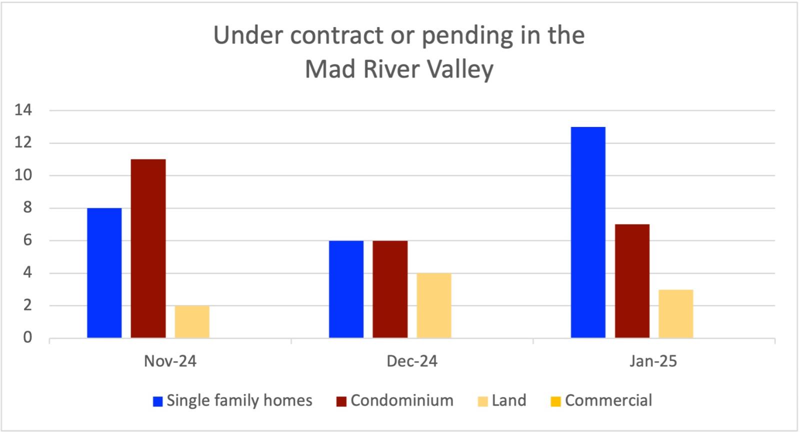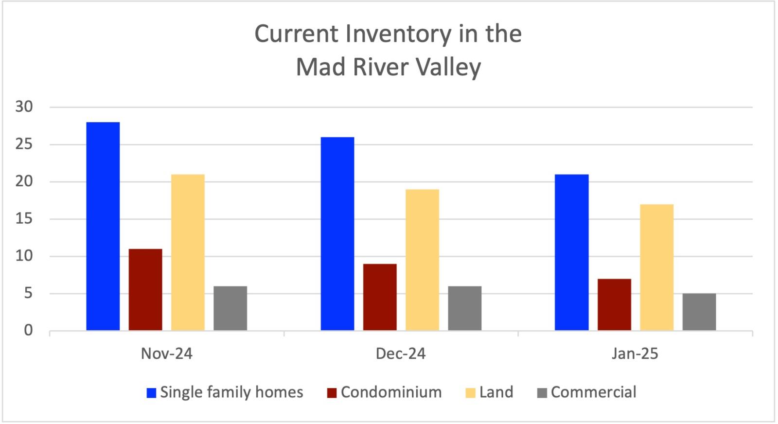 The current inventory in the Mad River Valley is down to 21 single family homes (26 this time last month), there are 7 whole-ownership condominiums (down from 9 this time last month), there are 17 undeveloped land parcels (19 this time last month), and 5 commercial properties (down from 6 last month). So, overall inventory is down. Historically we do not see a lot of new listings come on during the winter months, but likely a few here or there in each category.
