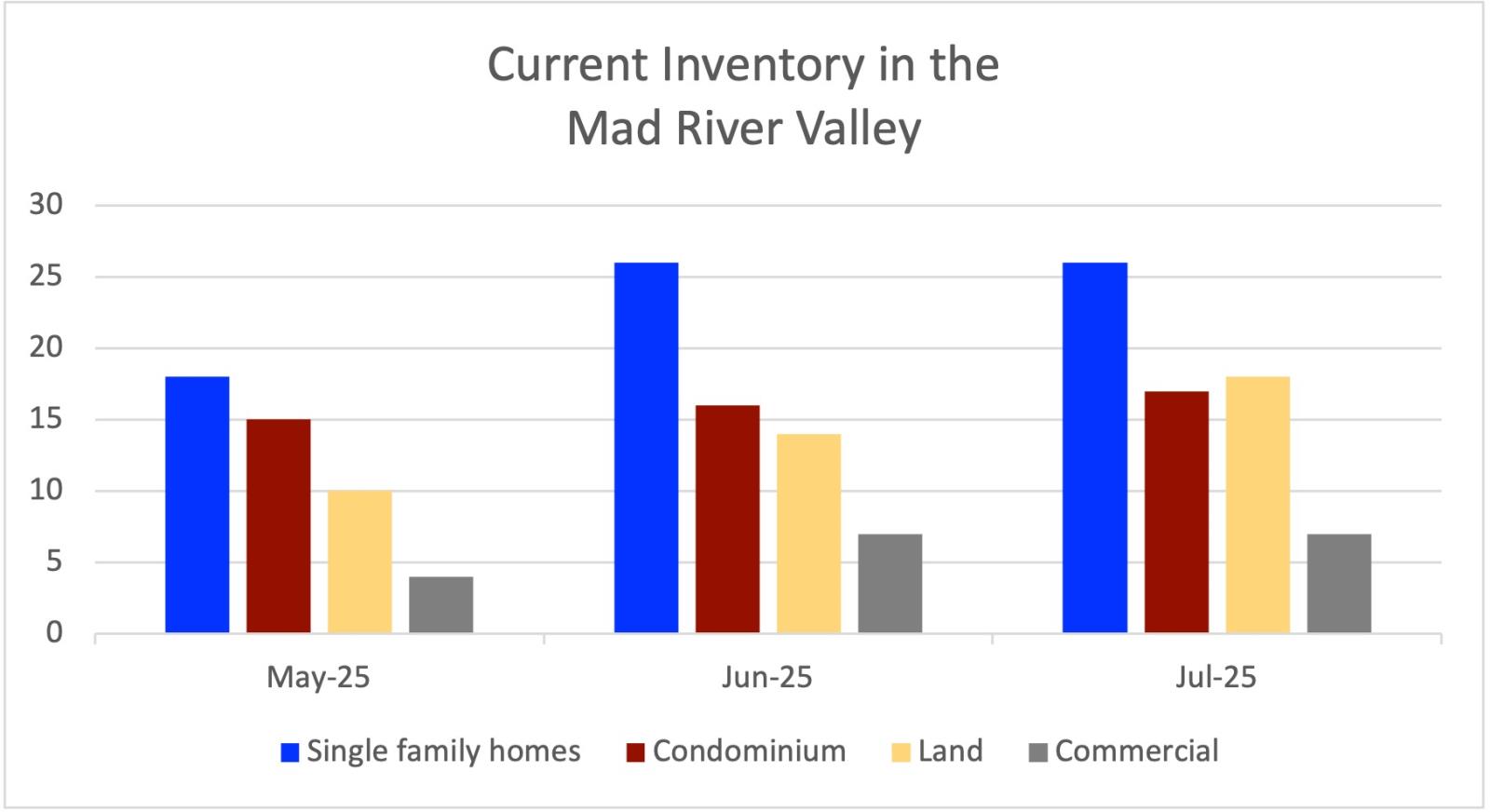 The current inventory in the Mad River Valley is @ 26 single family homes (26 this time last month too), there are 17 whole-ownership condominiums (16 this time last month), there are 18 undeveloped land parcels (14 this time last month), and 7 commercial properties (7 this time last month as well).