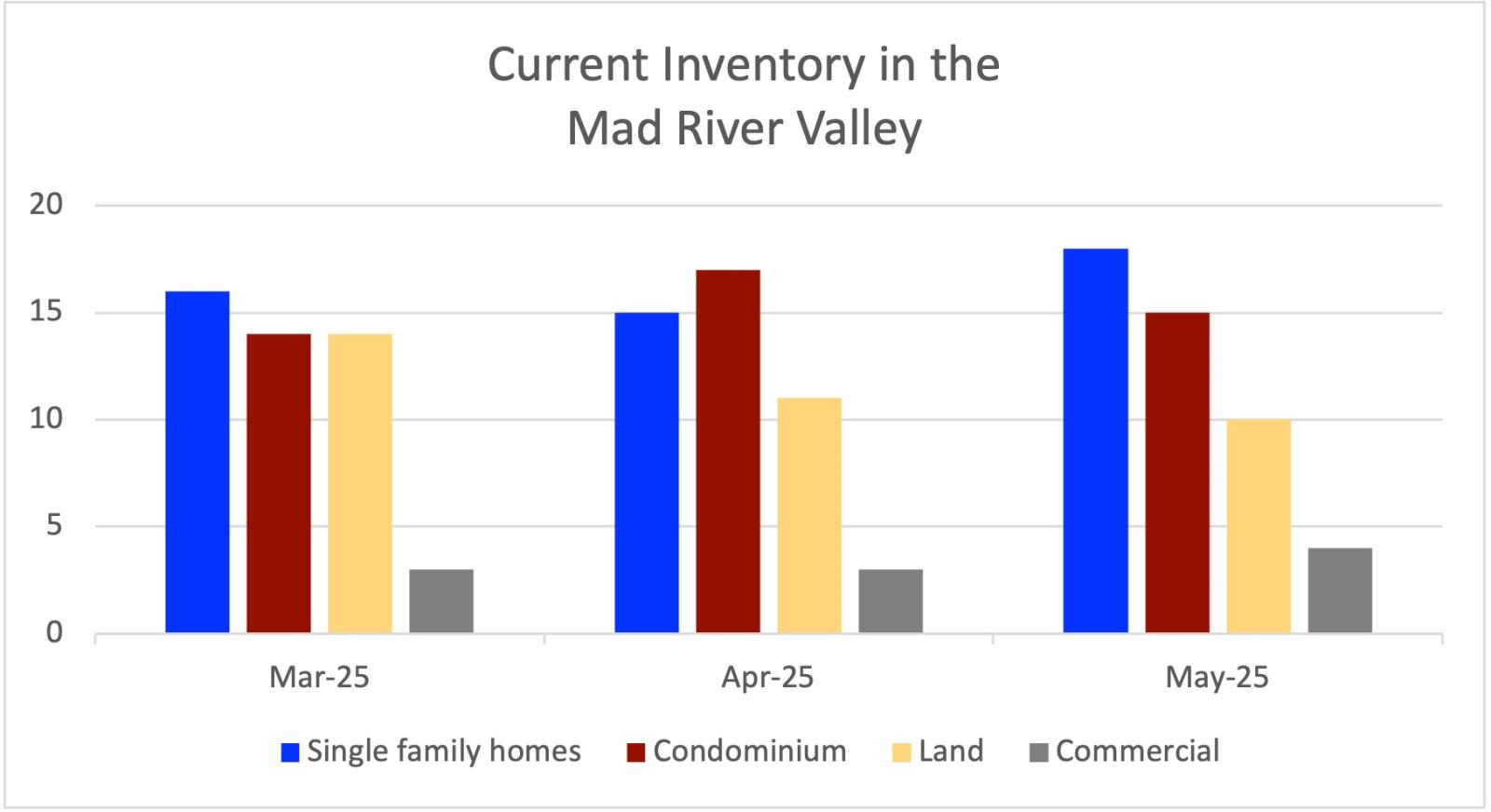 The current inventory in the Mad River Valley is up to 18 single family homes (15 this time last month), there are 15 whole-ownership condominiums (down from 17 this time last month), there are 10 undeveloped land parcels (11 this time last month), and 4 commercial properties (3 this time last month).