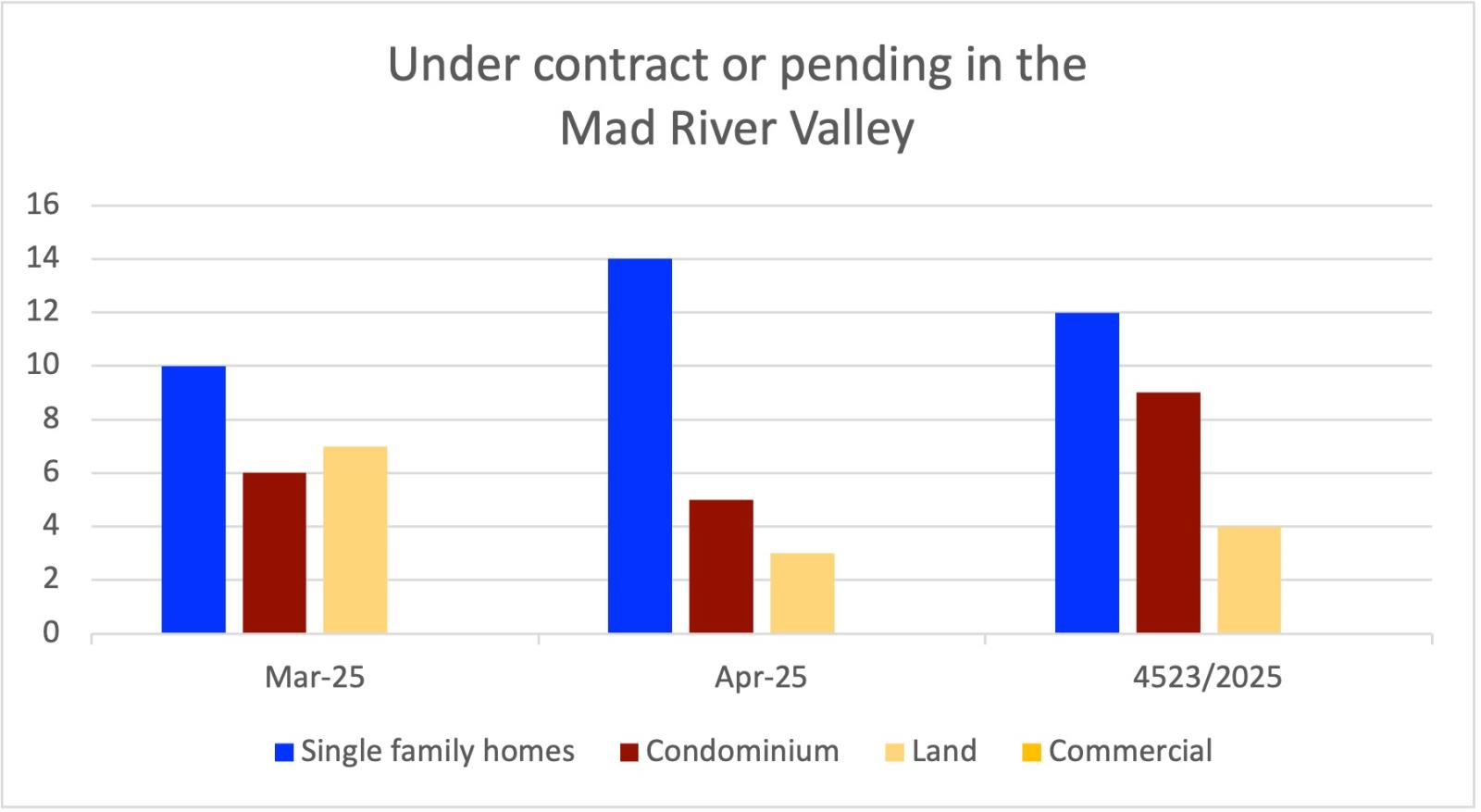 Regarding the properties that are currently under contract, 2 of the 9 condos, 1 of the 12 single family homes, and zero of the 4 land parcels were listed after April 1, 2025. The spring market typically doesn’t move as quickly as the upcoming summer selling season. We’ll have to see what the next few months bring, but Vermont and the Mad River Valley continue to attract buyers, for good reason!