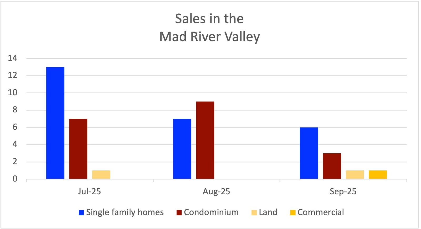 There were 6 single family home sales in September 2025 from $404,000 - $1,600,000 (down from 7 sales in August). There were 3 whole-ownership condominium sales from $206,000 - $530,000 (down from 9 sale in August). There was ONE undeveloped land sale in September (ZERO sales in August). There was One commercial sale in September for $675,000 (ZERO sales in August).