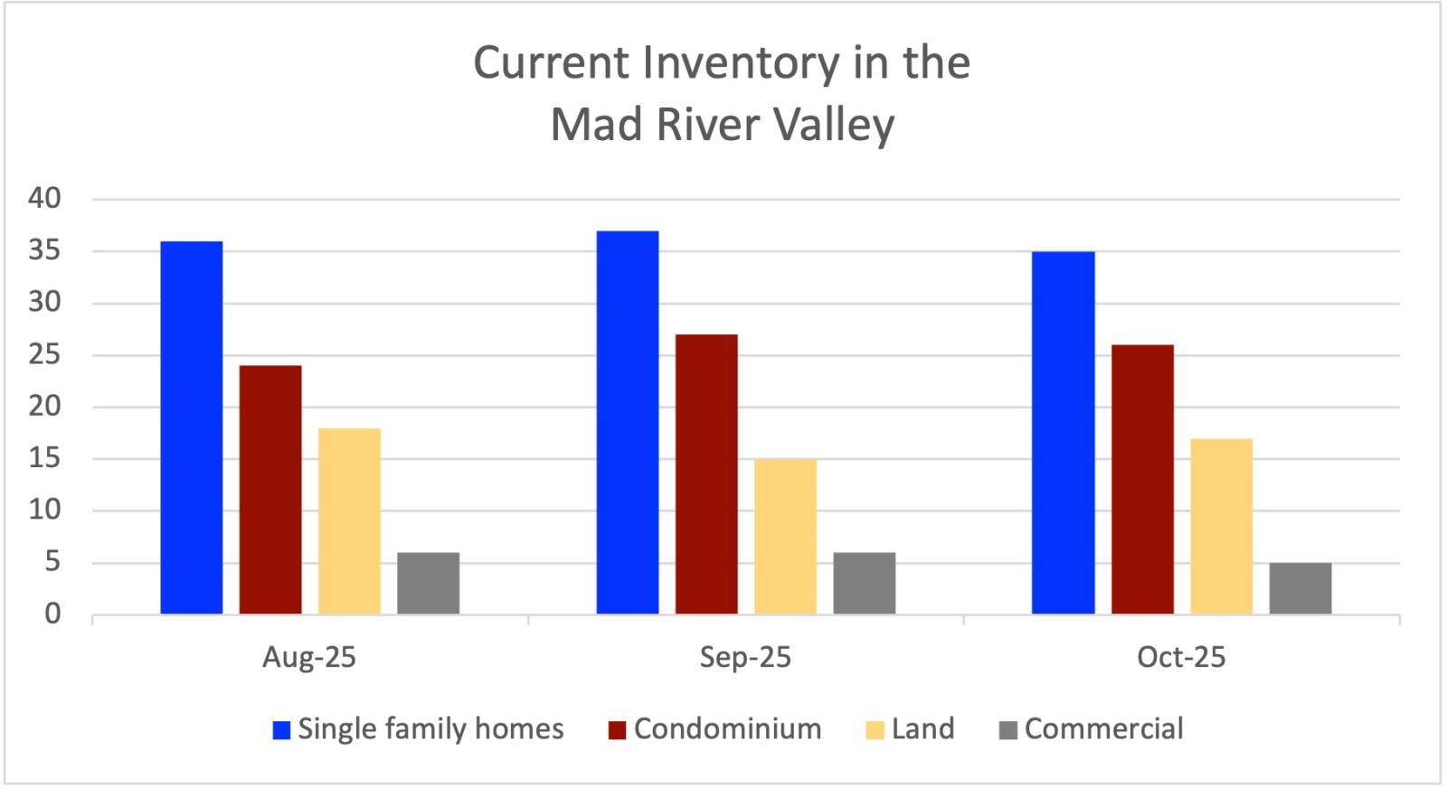 The current inventory in the Mad River Valley is @ 35 single family homes (37 this time last month), there are 26 whole-ownership condominiums (26 this time last month as well), there are 17 undeveloped land parcels (15 this time last month), and 5 commercial properties (6 this time last month).