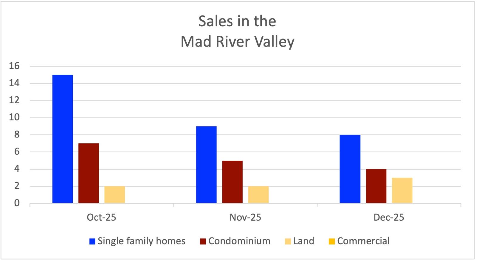 There were 8 single family home sales in December 2025 from $360,000 - $2,350,000 (down from 9 sales in November). There were 4 whole-ownership condominium sales from $130,000 - $600,000 (down from 5 sale in November). There were 3 undeveloped land sales in December from $250,000 - $640,000 (down from 2 sales in November). There were ZERO commercial sales in December (ZERO sales in November too).