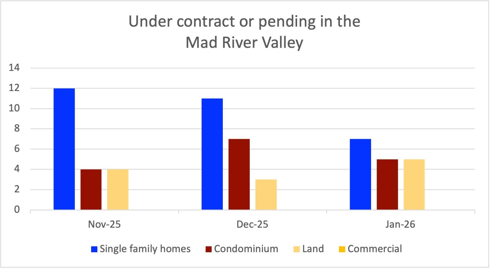 Regarding the properties that are currently under contract, 1 of the 5 condos, 2 of the 7 single family homes, and 2 of the 5 land parcels were listed after December 1, 2025. While fewer properties get listed during the winter months, buyers still have their fingers on the pulse of the market and are acting swiftly if they like what they see!