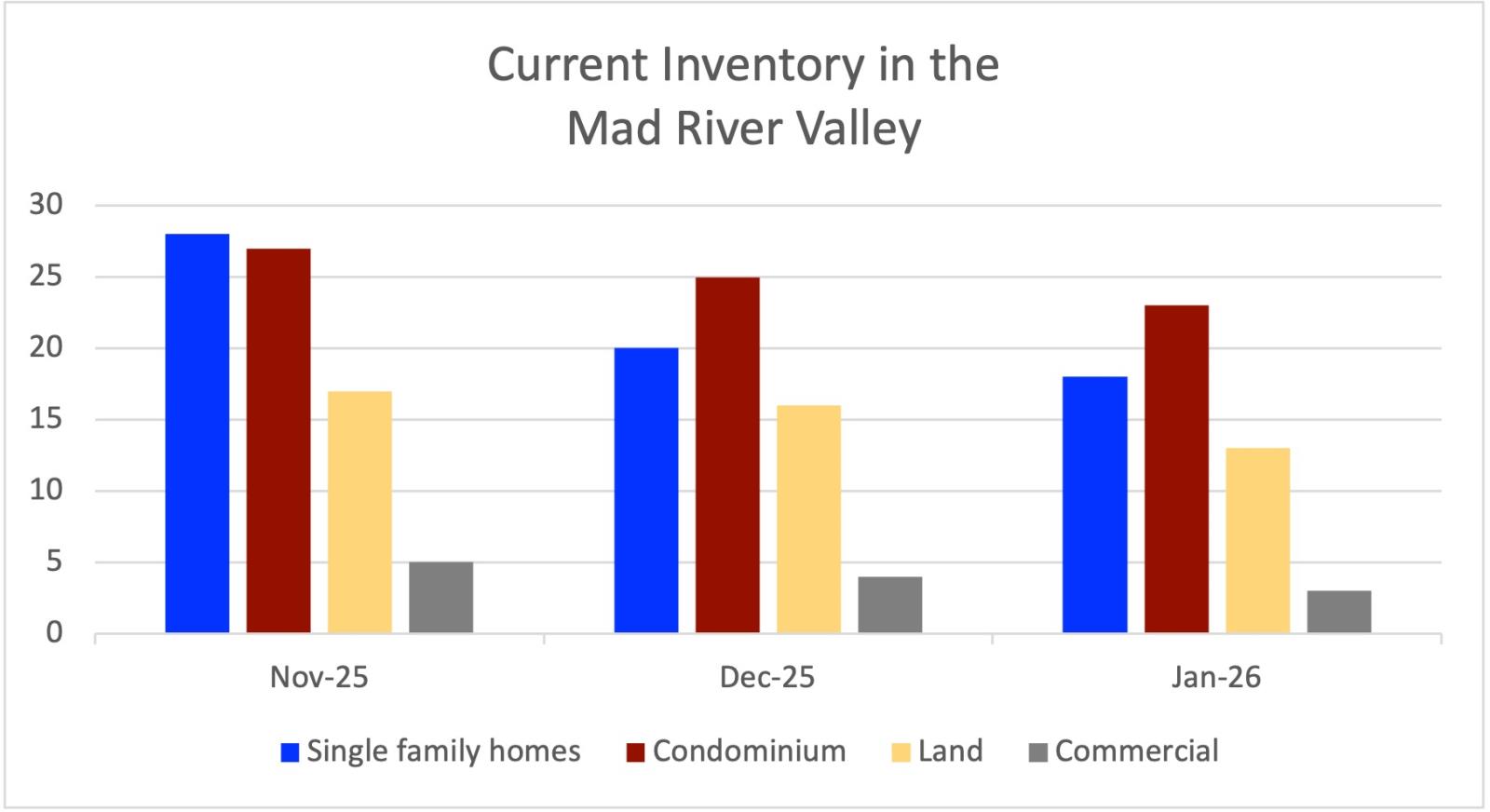 The current inventory in the Mad River Valley is @ 18 single family homes (20 this time last month), there are 23 whole-ownership condominiums (25 this time last month), there are 13 undeveloped land parcels (16 this time last month), and 3 commercial properties (4 this time last month).