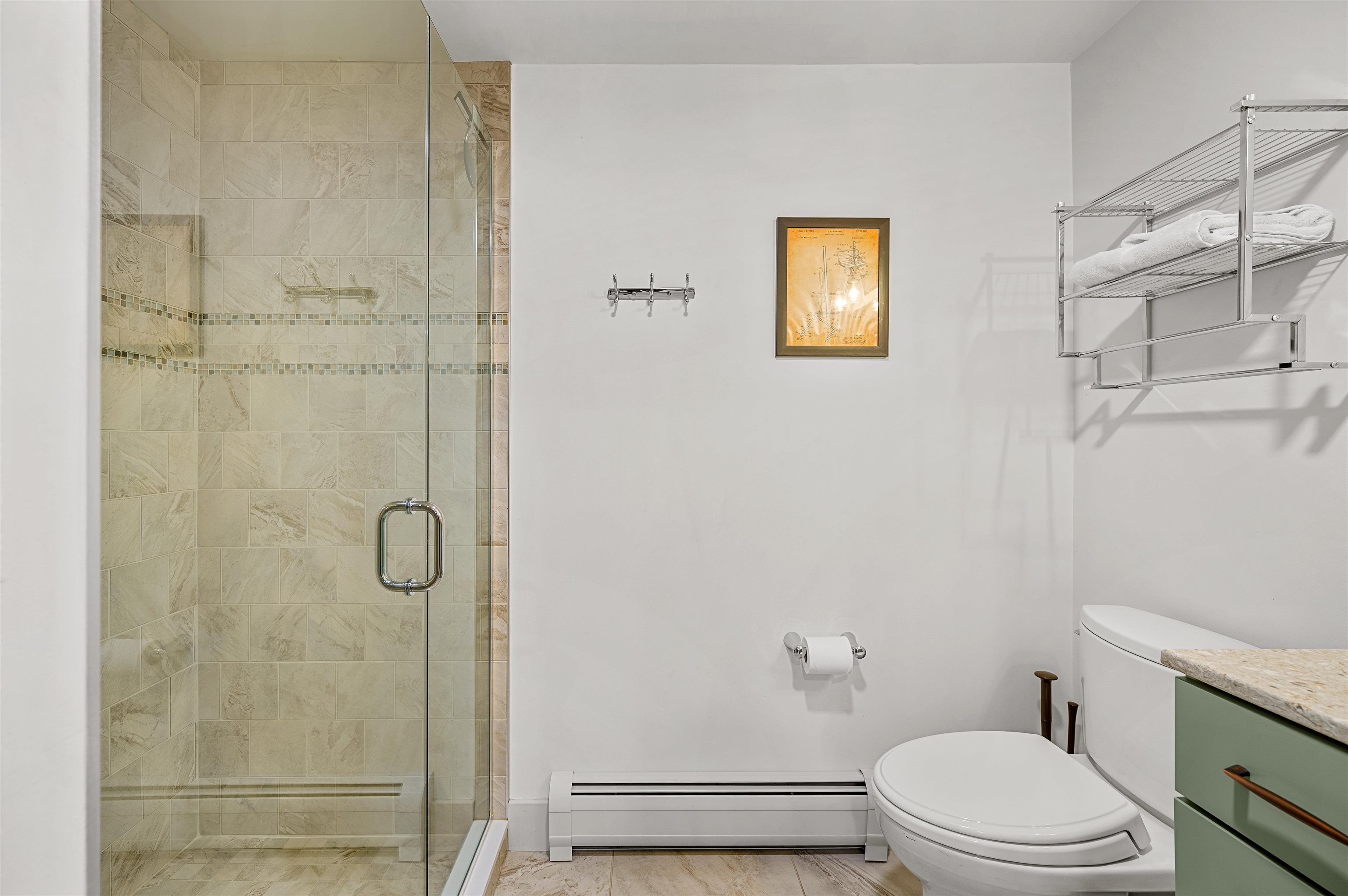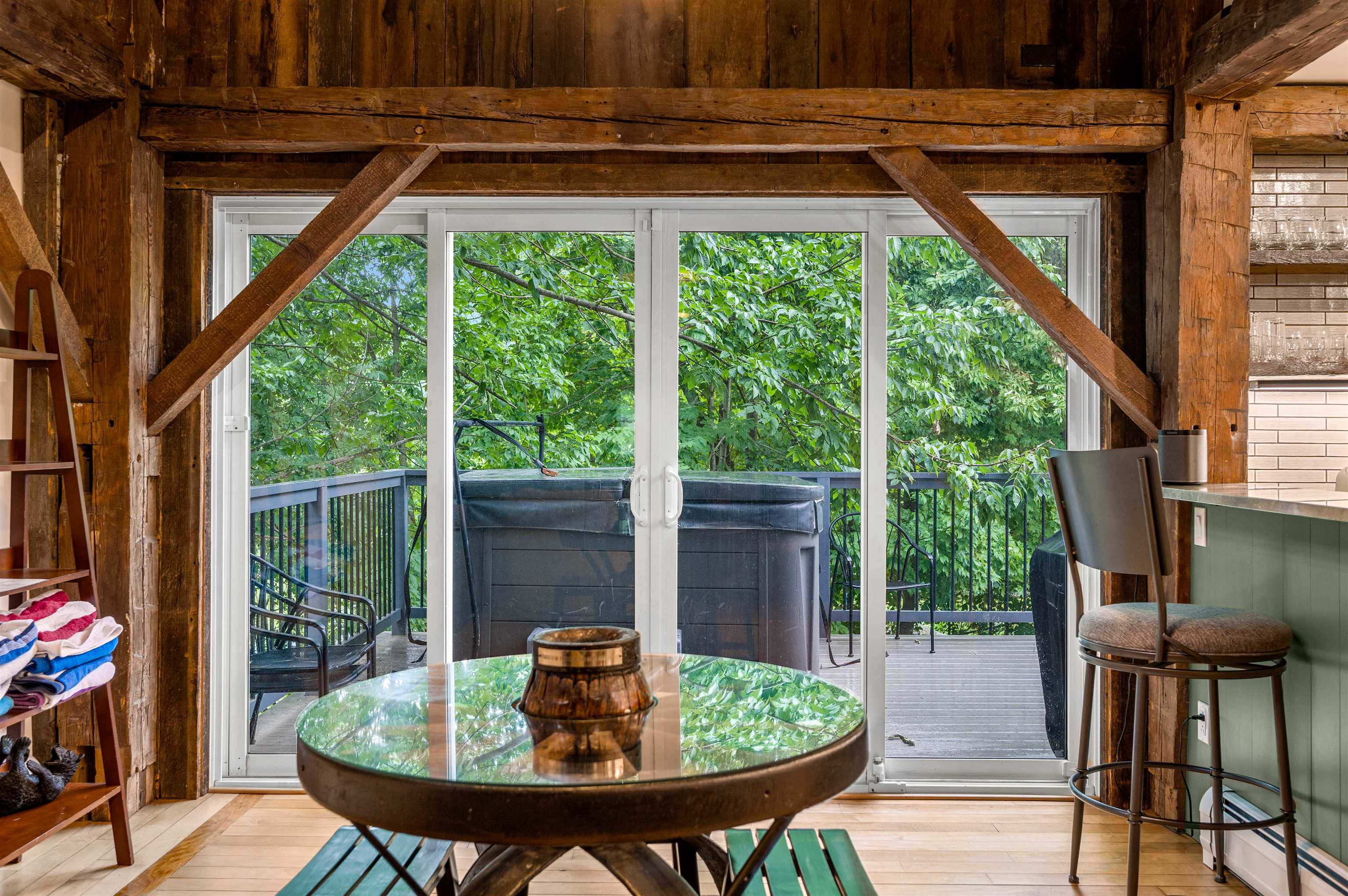 Transport yourself to a piece of history within this enchanting two-story condo, reminiscent of the barn's illustrious past. The commanding central fireplace, an ode to yesteryears, serves as the heart of this space, harmonizing vintage allure with contemporary convenience. Formerly the location of the renowned Common Man restaurant, this extraordinary property has undergone a million-dollar renovation to transform into a haven of relaxation & adventure. Nestled between the majestic peaks of Lincoln Peak & Mount Ellen, with the famed Mad River Glen just a stone's throw away. You need to walk up 4 steps to the unit and two bedrooms are on the second floor. Upon entry, experience the privacy of a separate, keyless access, ensuring a tranquil retreat. As summers grow warmer, relish in the comfort of air conditioning. The central wood-burning fireplace invites intimate gatherings on crisp evenings, preserving the barn's rustic charm. A mudroom thoughtfully accommodates outdoor gear & there are washer/dryers on both levels. The open floor plan seamlessly combines a modern kitchen, dining area, and living space. Adjacent is a dedicated TV area, complete with a sleeper sofa and a generous 55" smart TV. Each of the three bedrooms is also equipped with a smart television. The main-level master bedroom offers a king-size bed & ensuite bathroom, while two queen bedrooms upstairs also feature ensuite bathrooms. Outside you will find a private hot tub, BBQ grill, and outdoor dining area.