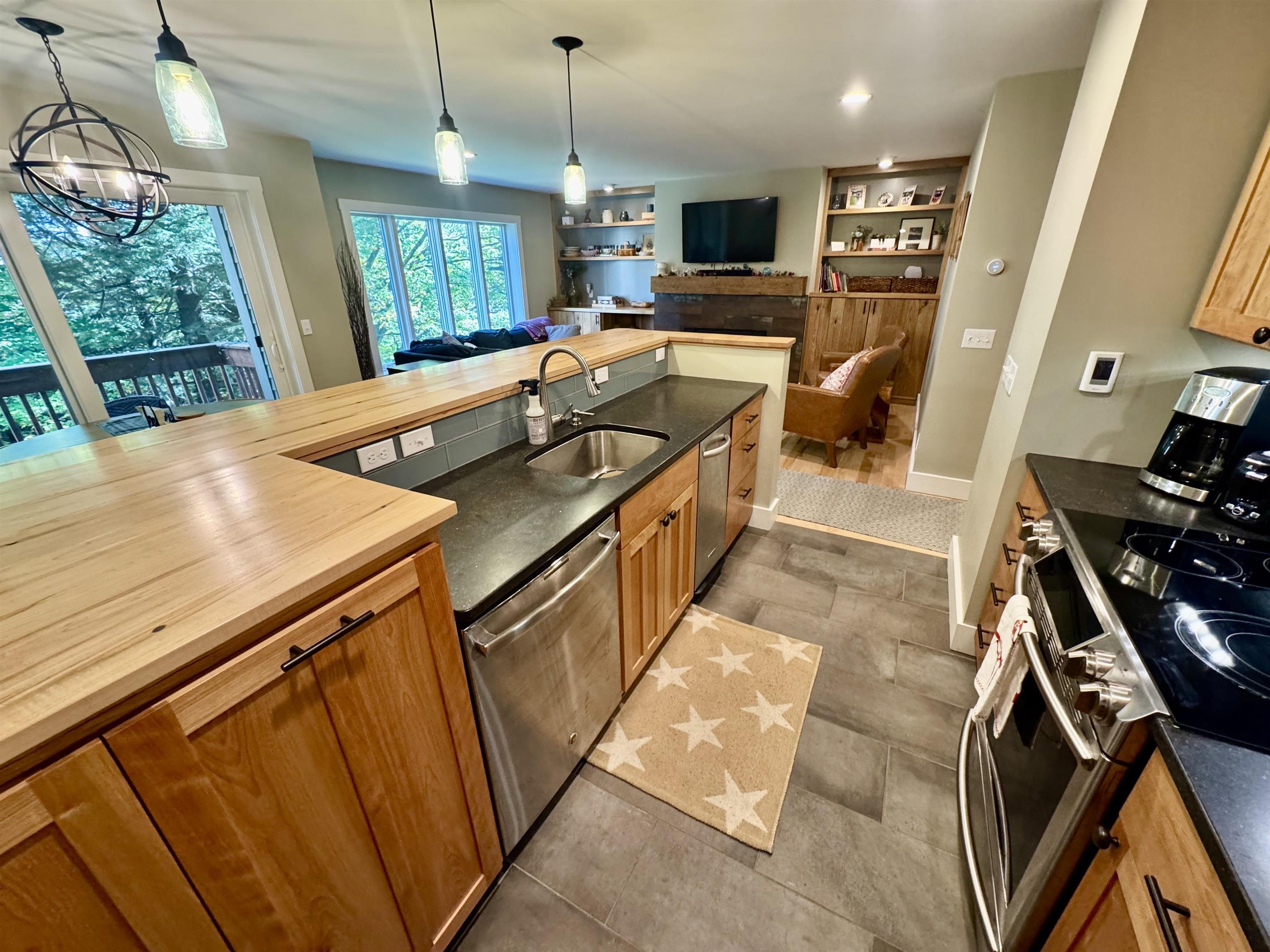 This beautifully renovated second-floor unit at the highly sought-after complex offers both style and convenience in the heart of Sugarbush. The open-concept kitchen features striking soapstone counters, a maple dining bar, and radiant-heated slate tile floors that flow seamlessly into the mudroom. Throughout the home, you'll find hardwood floors, solid wood doors, nice carpeting in the bedrooms, high-quality fixtures, and a wood-burning fireplace insert that creates a warm, inviting atmosphere. A newer washer/condensing dryer adds to the ease of living. Enjoy a wide range of amenities just outside your door: a heated summer pool, world-class mountain bike trails, disc golf, and hiking. For golfers, the Robert Trent Jones, Sr. Golf Course is only minutes away. And, of course, legendary Sugarbush skiing is just steps from your front door--making this an ideal year-round mountain retreat. Showings begin on 10/3/2025.