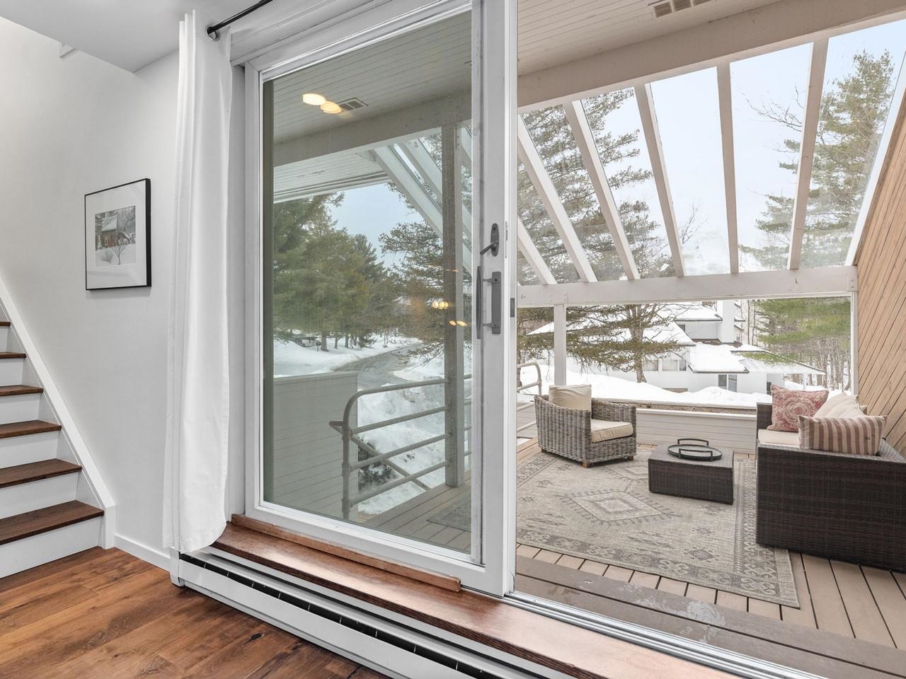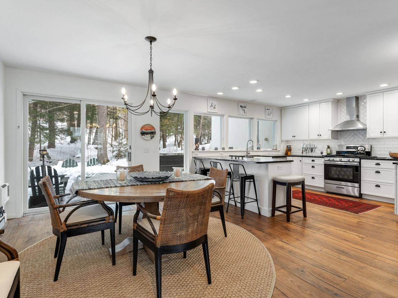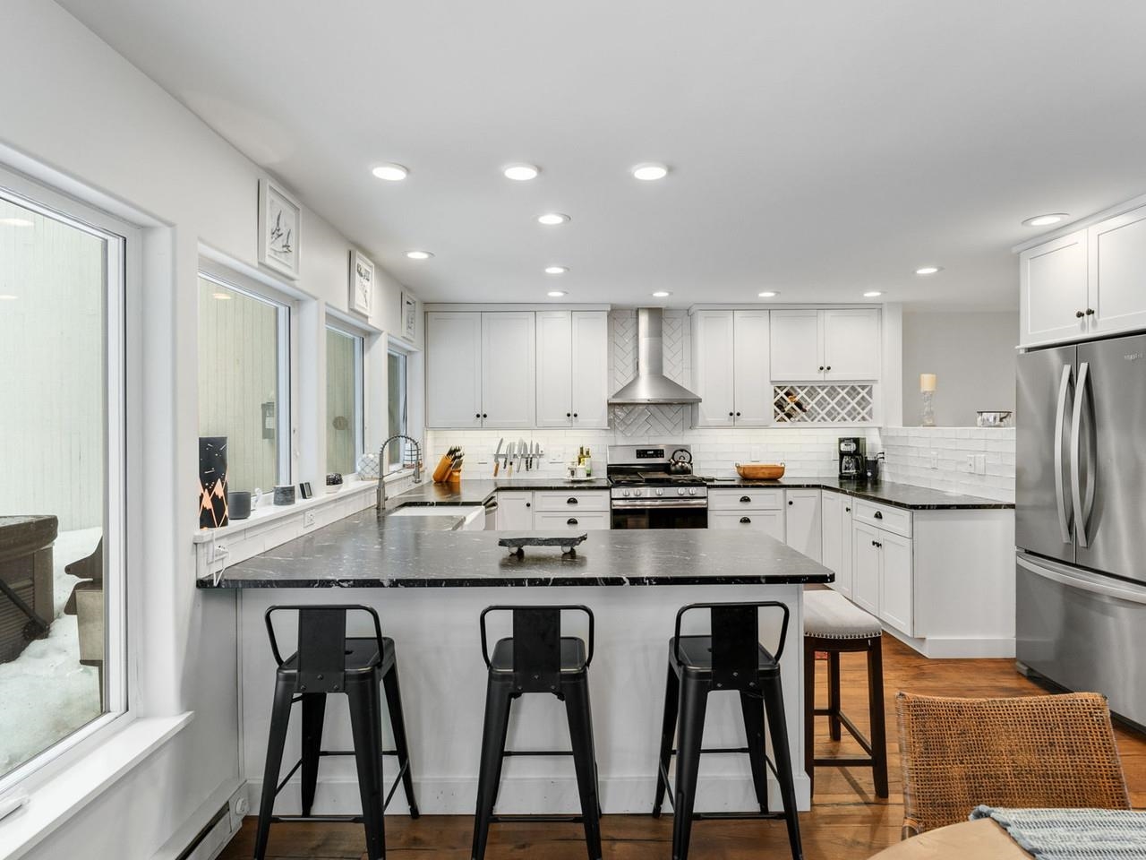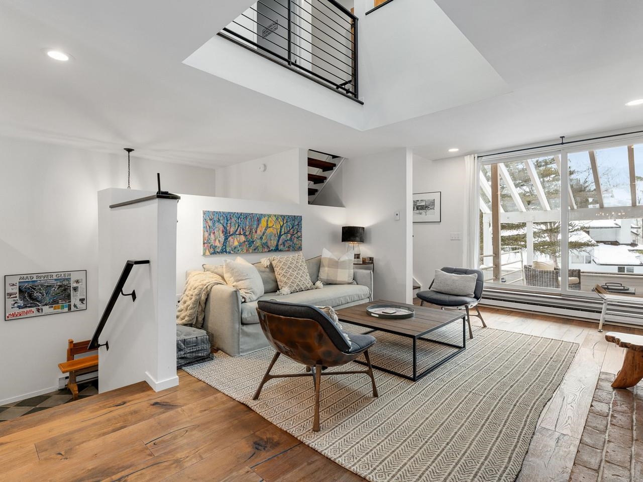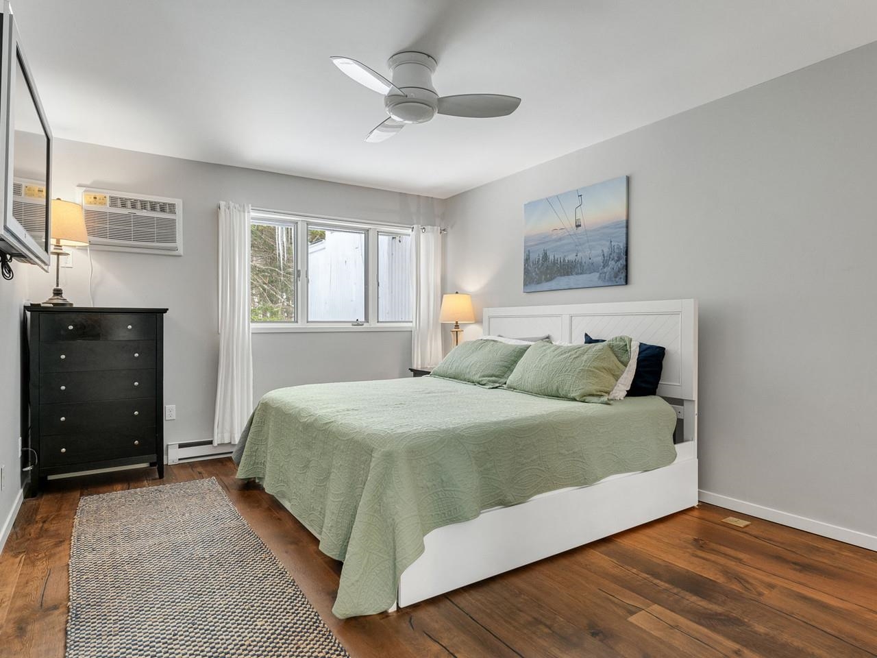 Classic, timeless renovations and sleek, modern furnishings adorn this spacious, professionally decorated townhome just minutes from Sugarbush Resort in the Mad River Valley. An enlarged kitchen features state-of-the-art appliances in stainless steel, a pro-quality gas range with hooded exhaust, farmhouse sink, subway tile backsplash, and leathered granite counters. Large windows bring in abundant light and fresh air. Abundant LED lighting makes the workspace bright and efficient. Hand-scraped wood flooring throughout, comfortable furnishings, and beautiful area rugs enhance the warmth and charm. Brick façade, barn beam mantel, and gas fireplace create a cozy atmosphere, and the large, wall-mounted TV is easy to watch. The upstairs primary bedroom includes a large, custom, tile walk-in shower with thick glass doors and plenty of room in a separate vanity area. Guest bedroom suite with private bath and large windows. Through the wall air conditioning in both bedrooms for those muggy, Vermont nights. The bonus room has been used as an office and extra sleeping area, but could be re-purposed to fit many needs, and 2nd floor laundry makes this the perfect primary or second home. Easy access to Sugarbush Resort and Mad River Glen from the shuttle that regularly comes through the complex, and right outside your front door!