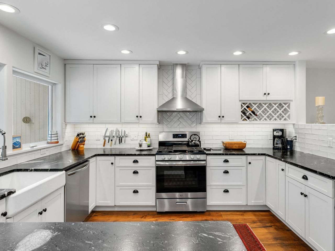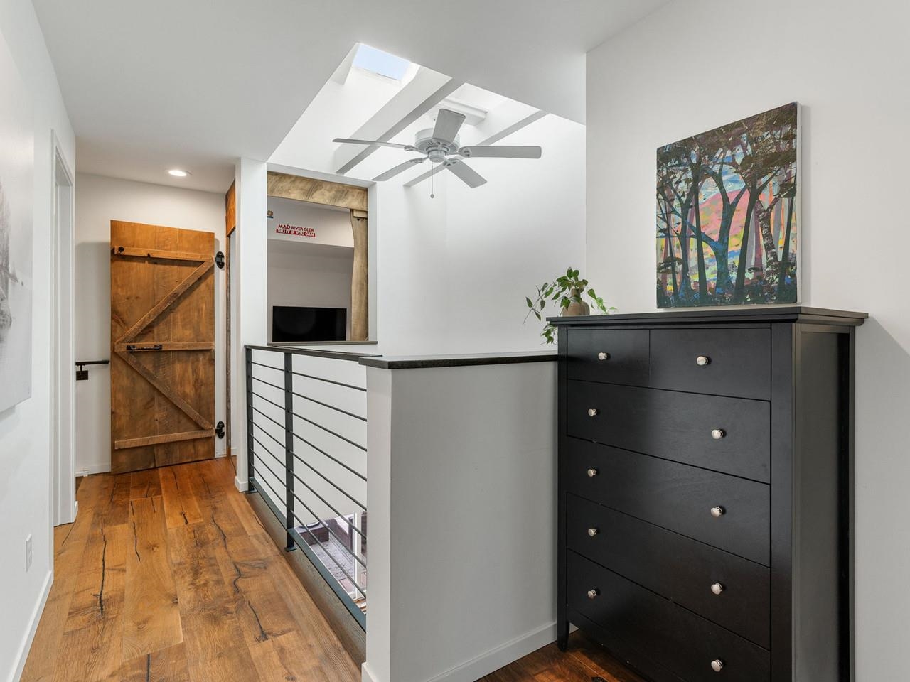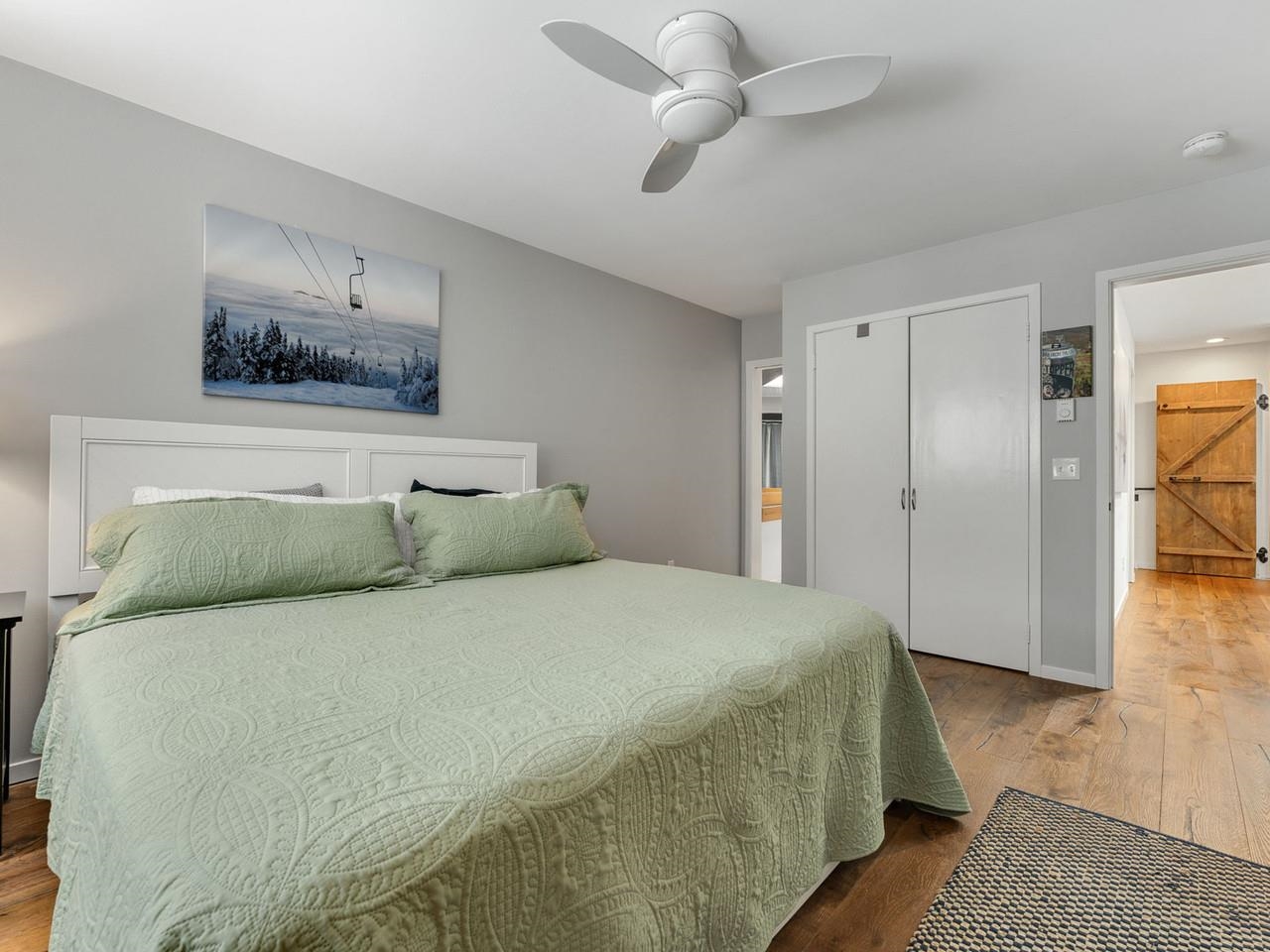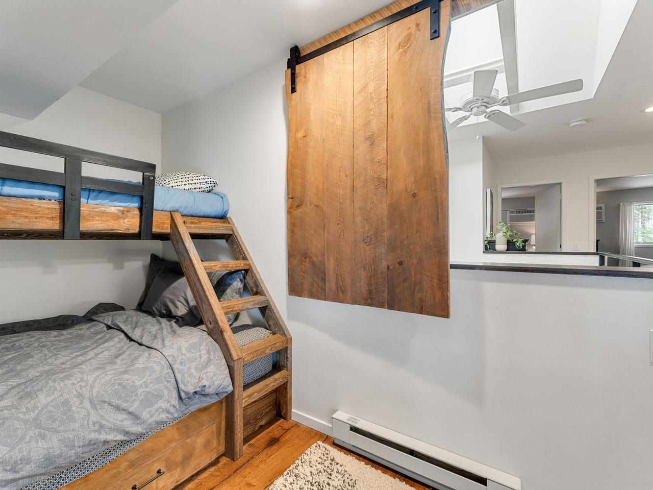 Classic, timeless renovations and sleek, modern furnishings adorn this spacious, professionally decorated townhome just minutes from Sugarbush Resort in the Mad River Valley. An enlarged kitchen features state-of-the-art appliances in stainless steel, a pro-quality gas range with hooded exhaust, farmhouse sink, subway tile backsplash, and leathered granite counters. Large windows bring in abundant light and fresh air. Abundant LED lighting makes the workspace bright and efficient. Hand-scraped wood flooring throughout, comfortable furnishings, and beautiful area rugs enhance the warmth and charm. Brick façade, barn beam mantel, and gas fireplace create a cozy atmosphere, and the large, wall-mounted TV is easy to watch. The upstairs primary bedroom includes a large, custom, tile walk-in shower with thick glass doors and plenty of room in a separate vanity area. Guest bedroom suite with private bath and large windows. Through the wall air conditioning in both bedrooms for those muggy, Vermont nights. The bonus room has been used as an office and extra sleeping area, but could be re-purposed to fit many needs, and 2nd floor laundry makes this the perfect primary or second home. Easy access to Sugarbush Resort and Mad River Glen from the shuttle that regularly comes through the complex, and right outside your front door!