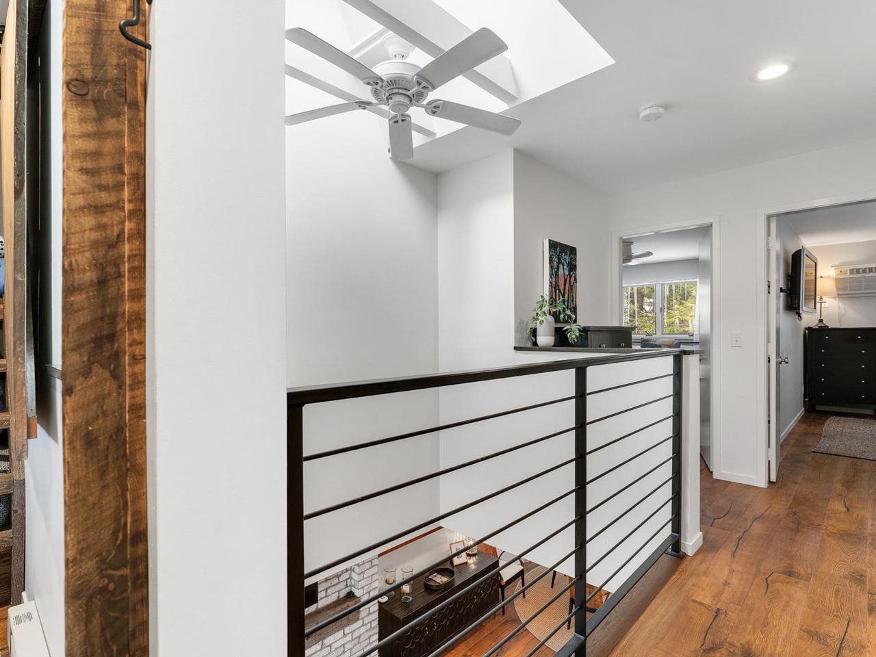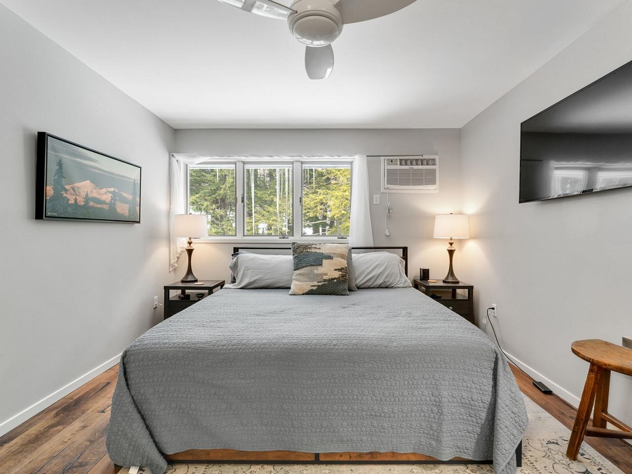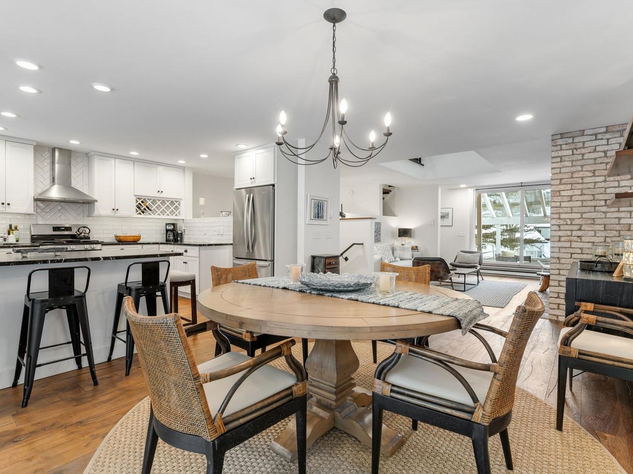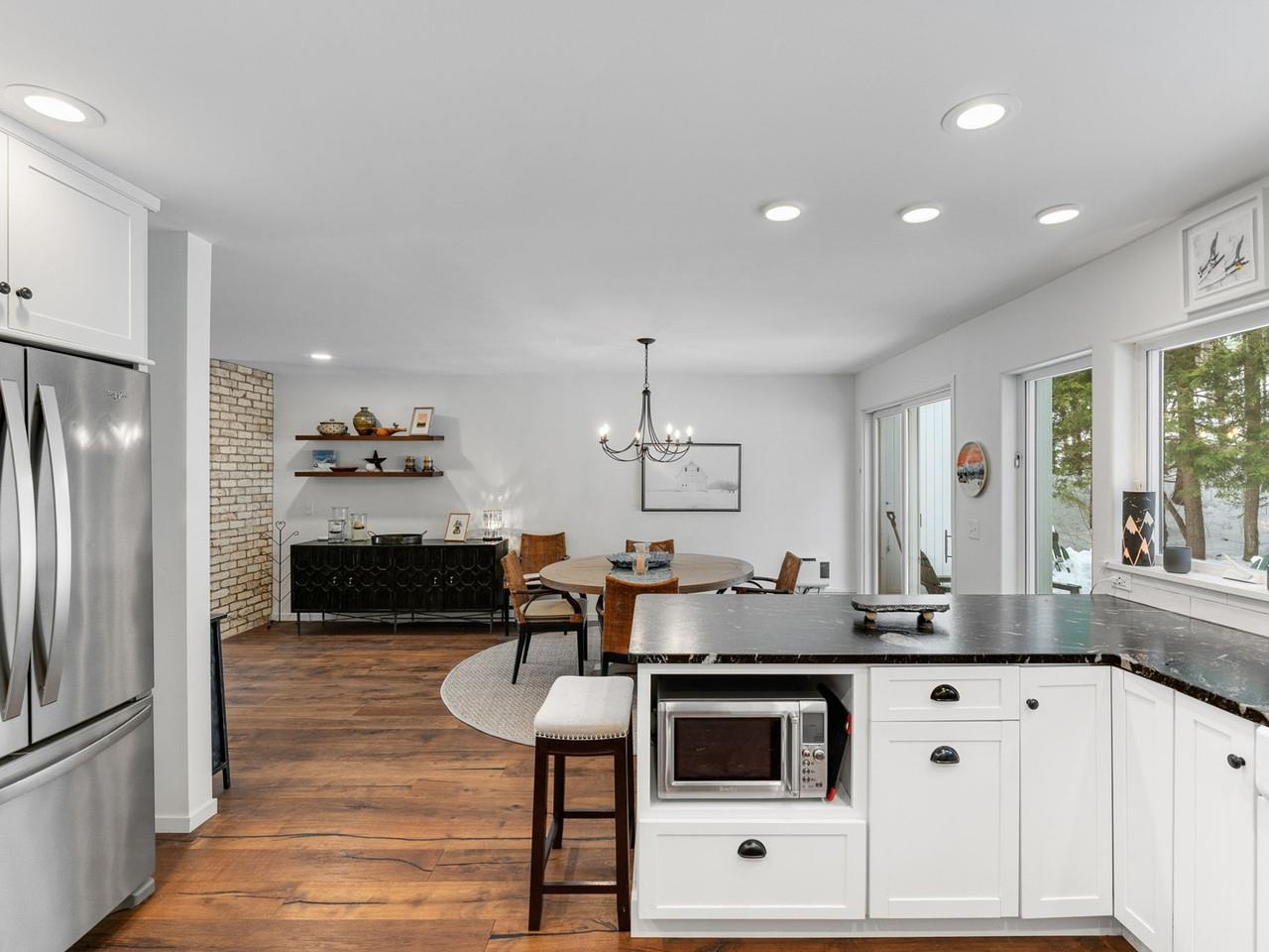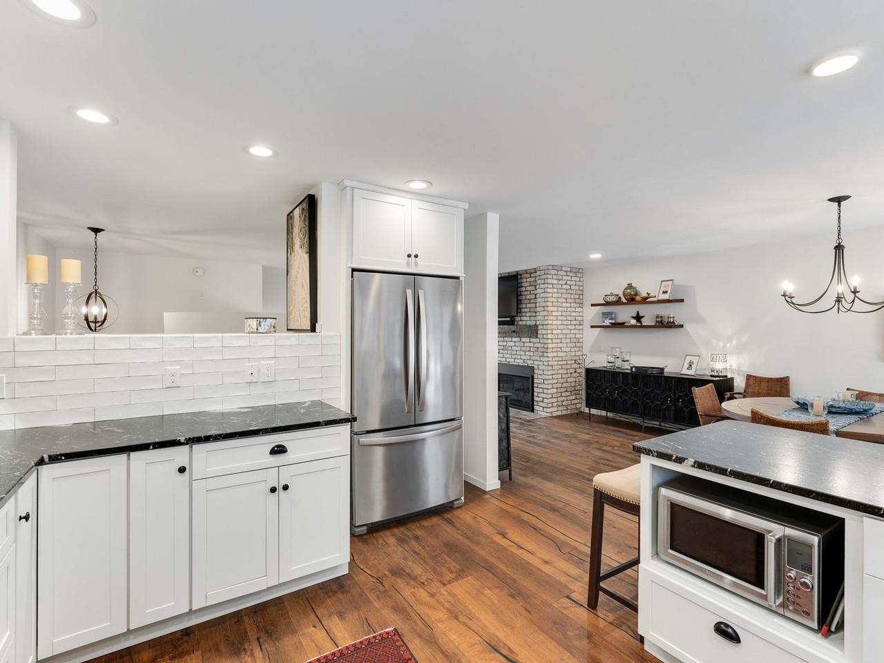 Classic, timeless renovations and sleek, modern furnishings adorn this spacious, professionally decorated townhome just minutes from Sugarbush Resort in the Mad River Valley. An enlarged kitchen features state-of-the-art appliances in stainless steel, a pro-quality gas range with hooded exhaust, farmhouse sink, subway tile backsplash, and leathered granite counters. Large windows bring in abundant light and fresh air. Abundant LED lighting makes the workspace bright and efficient. Hand-scraped wood flooring throughout, comfortable furnishings, and beautiful area rugs enhance the warmth and charm. Brick façade, barn beam mantel, and gas fireplace create a cozy atmosphere, and the large, wall-mounted TV is easy to watch. The upstairs primary bedroom includes a large, custom, tile walk-in shower with thick glass doors and plenty of room in a separate vanity area. Guest bedroom suite with private bath and large windows. Through the wall air conditioning in both bedrooms for those muggy, Vermont nights. The bonus room has been used as an office and extra sleeping area, but could be re-purposed to fit many needs, and 2nd floor laundry makes this the perfect primary or second home. Easy access to Sugarbush Resort and Mad River Glen from the shuttle that regularly comes through the complex, and right outside your front door!