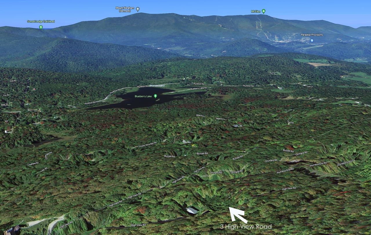 High above the Mad River Valley directly across from 140 acres of Green Mountain National Forest is this beautiful high elevation lot with great Sugarbush winter views across Blueberry Lake that could be truly spectacular with clearing. Those 140 acres abut 3,174 Roxbury State Forest acres for over 3,300 acre access. Wilderness eternal for your hiking, backcountry skiing and hunting. 3BR already issued state wastewater permit and a roughed in driveway down to a terrace house site near the pile of stones that straddles the northern boundary, parallel to and at about the same elevation as the blue house next door just to the south. Beautiful homes on High View and below on Journey's End boost property value and you can get a crystal clear idea of what the cleared view will look like by looking out across the abutting cleared double parcel to the north from High View Road. If eagles nest views aren't your mark, consider building farther down on the western hillside below the stunning winter ice falls and dramatic ledge outcropping. The Mad River Valley at it's Prickly Mountain area best.