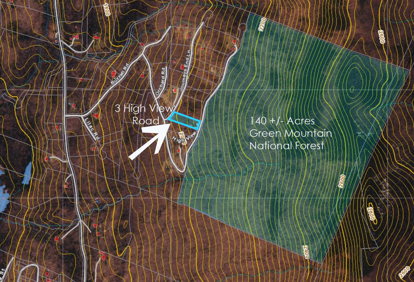 High above the Mad River Valley directly across from 140 acres of Green Mountain National Forest is this beautiful high elevation lot with great Sugarbush winter views across Blueberry Lake that could be truly spectacular with clearing. Those 140 acres abut 3,174 Roxbury State Forest acres for over 3,300 acre access. Wilderness eternal for your hiking, backcountry skiing and hunting. 3BR already issued state wastewater permit and a roughed in driveway down to a terrace house site near the pile of stones that straddles the northern boundary, parallel to and at about the same elevation as the blue house next door just to the south. Beautiful homes on High View and below on Journey's End boost property value and you can get a crystal clear idea of what the cleared view will look like by looking out across the abutting cleared double parcel to the north from High View Road. If eagles nest views aren't your mark, consider building farther down on the western hillside below the stunning winter ice falls and dramatic ledge outcropping. The Mad River Valley at it's Prickly Mountain area best. Note 3 High View Road is arbitrary. The actual 911 address is still to be assigned.