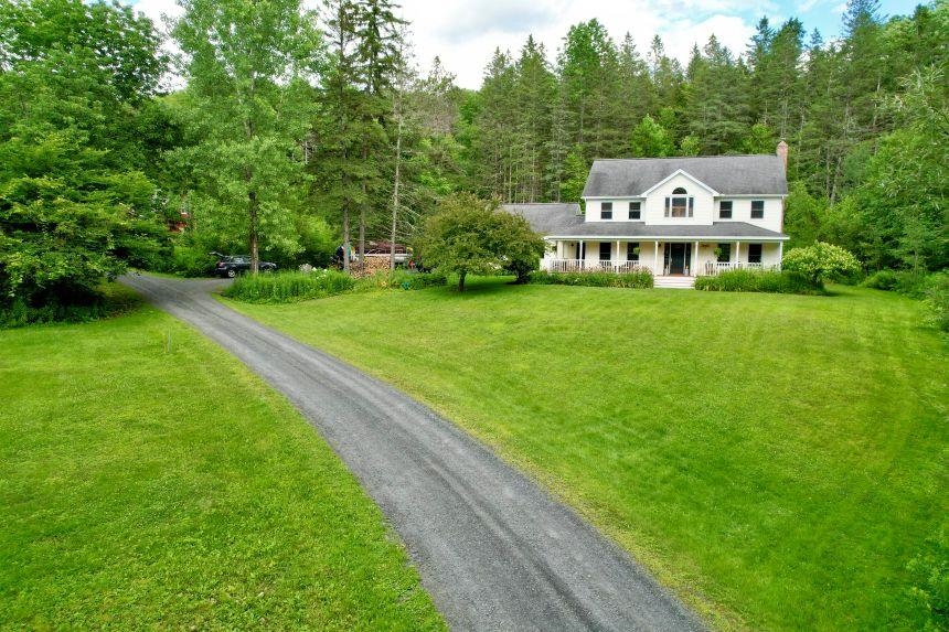In the heart of the Green Mountains, this modern Colonial is ready for your next adventure! Close to Stowe and Waterbury Village, recreation abounds for skiing, riding, hiking, biking and all manner of water sports at the Waterbury Reservoir! Offering an open floor plan, featuring oak and tile floors, large kitchen with new Quartz counters and updated appliances. Relax next to the brick hearth fireplace for cozy winter nights. The family room offers privacy and the large mudroom is perfect for all seasons. Upstairs is a pleasing and large primary bedroom with private bath, including jetted tub along with 3 more bedrooms and full bath, featuring large windows, oak floors and ceiling fans. New lighting fixtures throughout! Relax on the huge covered porch. Plus, plenty of room for projects and more in the 2-car garage and large, dry basement. A sun deck and attached shed / carport are welcome additions. Berry bushes and mature perennials go well with this private slice of heaven!