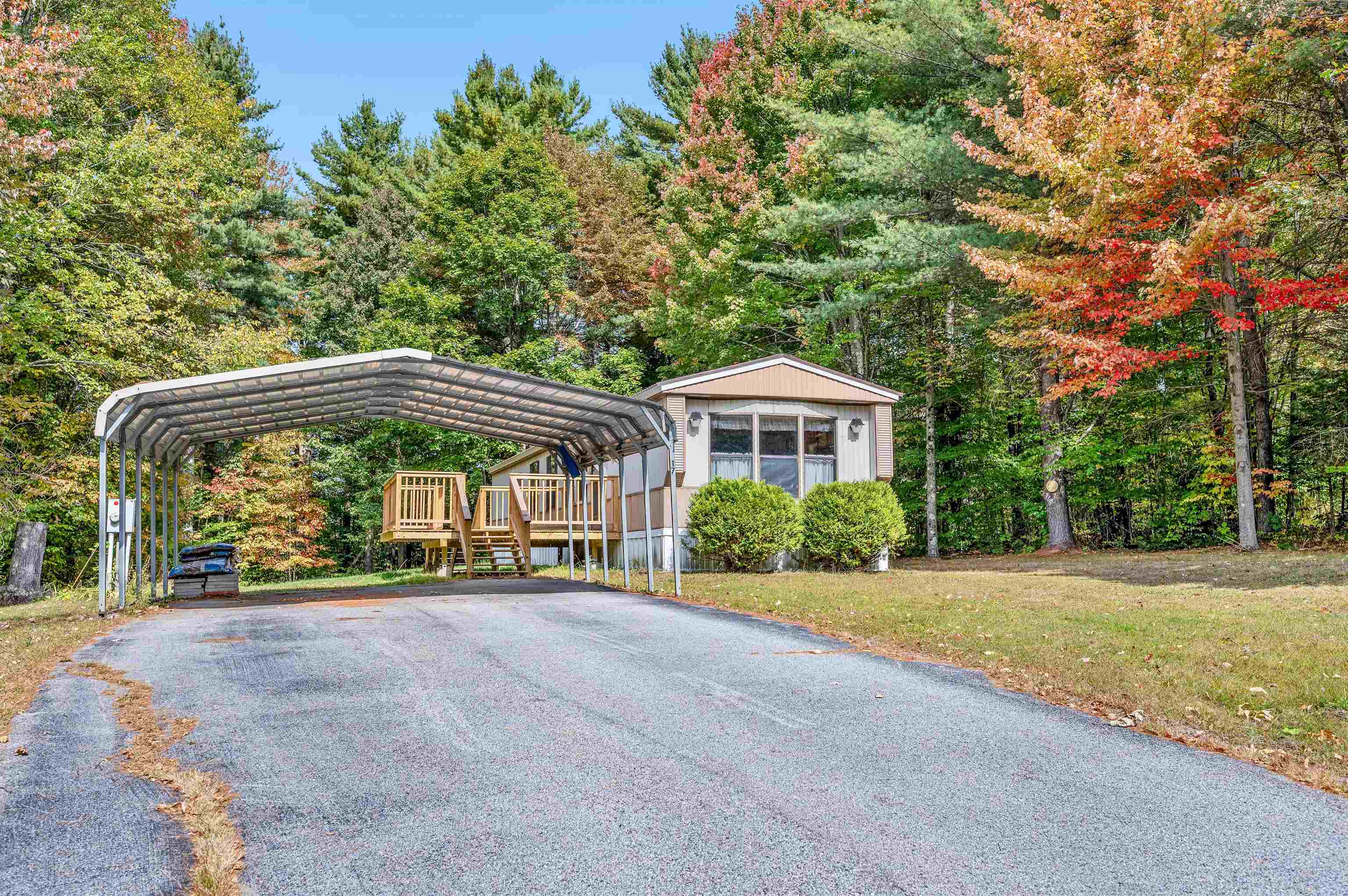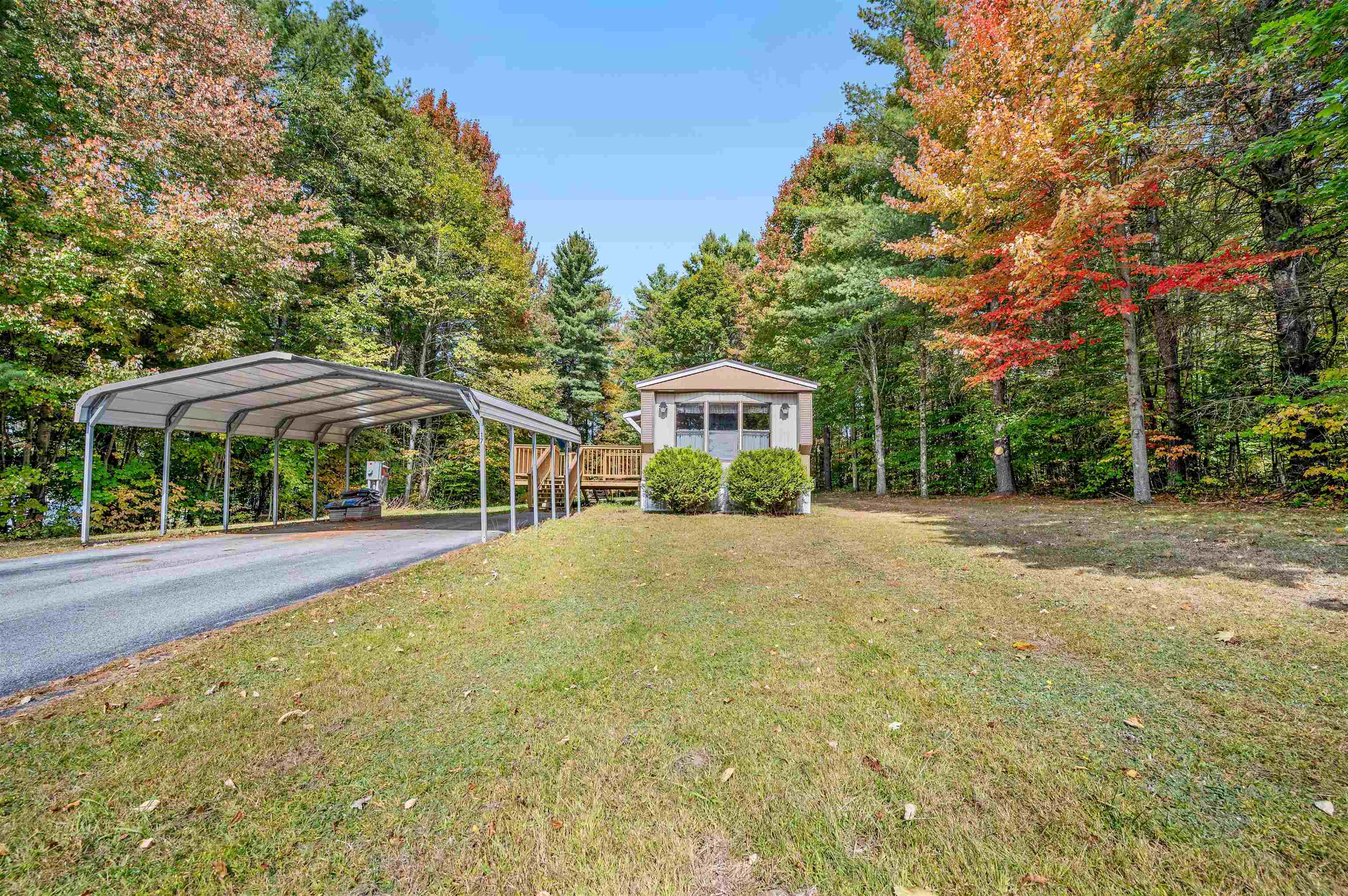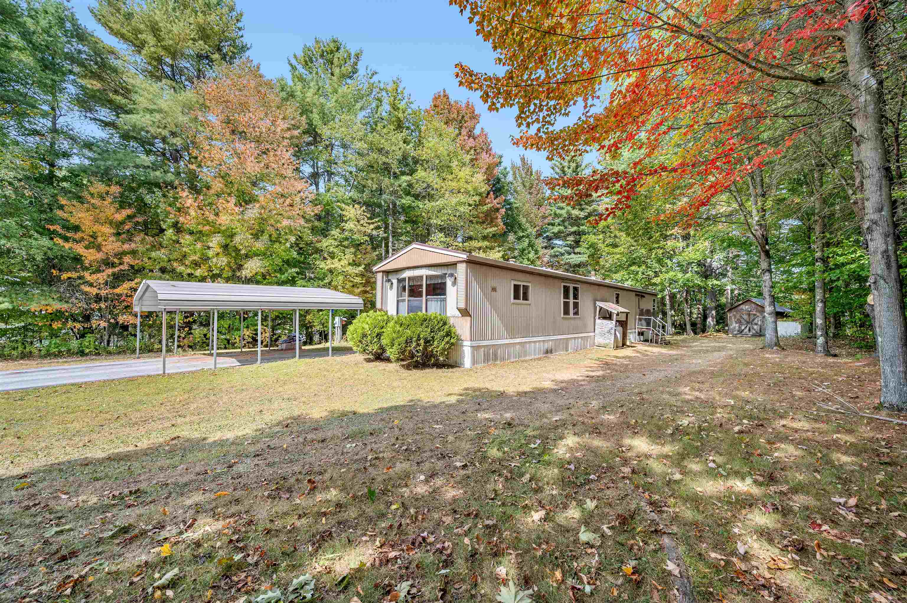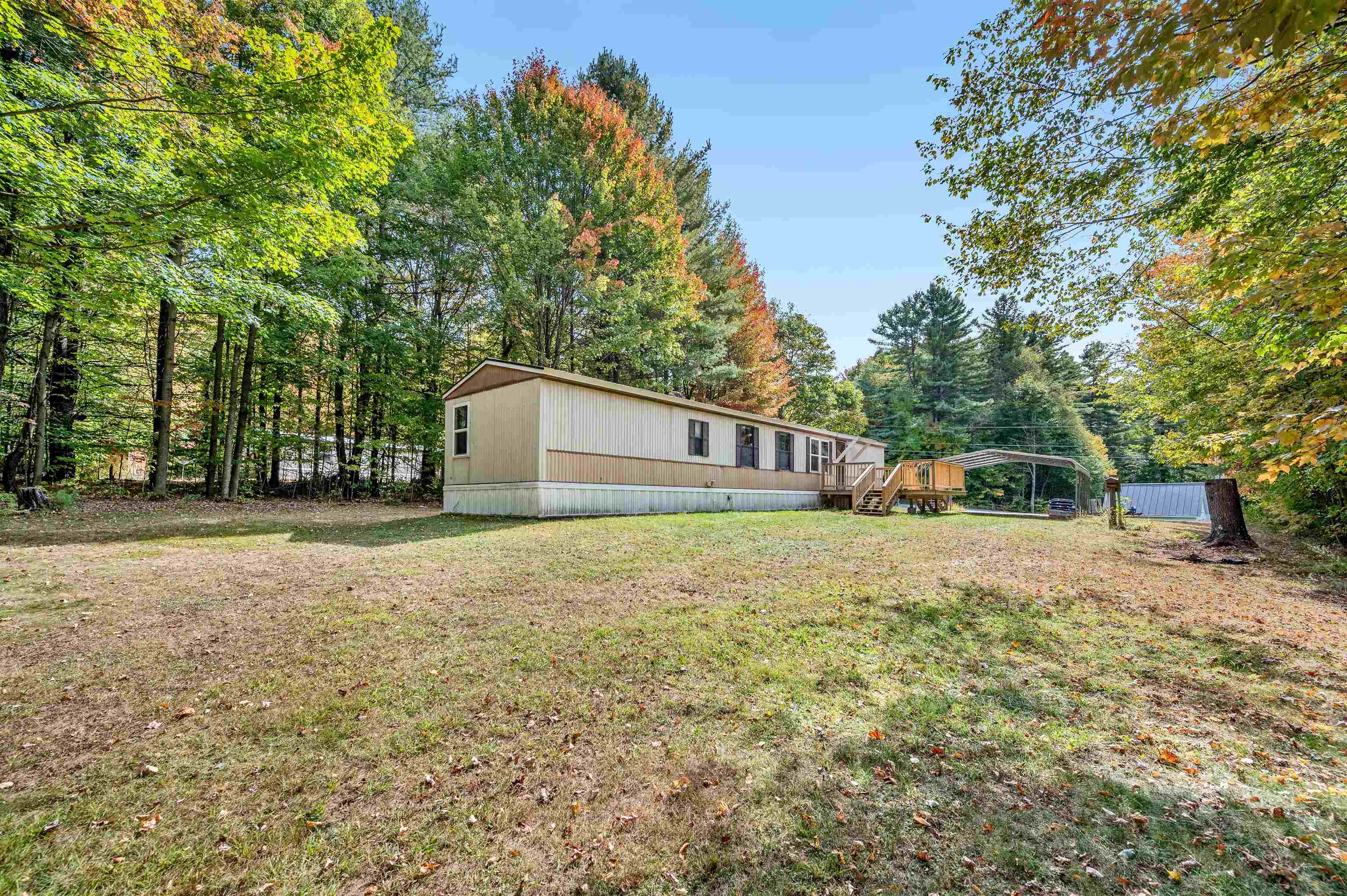 Discover easy living in this two-bedroom singlewide mobile home, situated on a generous 0.91-acre lot at the end of a quiet cul-de-sac. The home features a functional layout including an eat-in kitchen, living room, and a full bathroom with a stand-up shower. The bathroom is conveniently connected to the main living area and the primary bedroom. The layout includes space to easily accommodate the addition of a tub. The exterior boasts a large, level, private yard with a 14x14 deck and two sheds for storage. Enjoy the convenience of town water and sewer, a carport, and a paved driveway. This convenient location is within walking distance to a local store, and close to town recreation fields and the town bike path. A great opportunity for comfortable living with easy access to amenities. Open House 10/4 from 12-2pm.