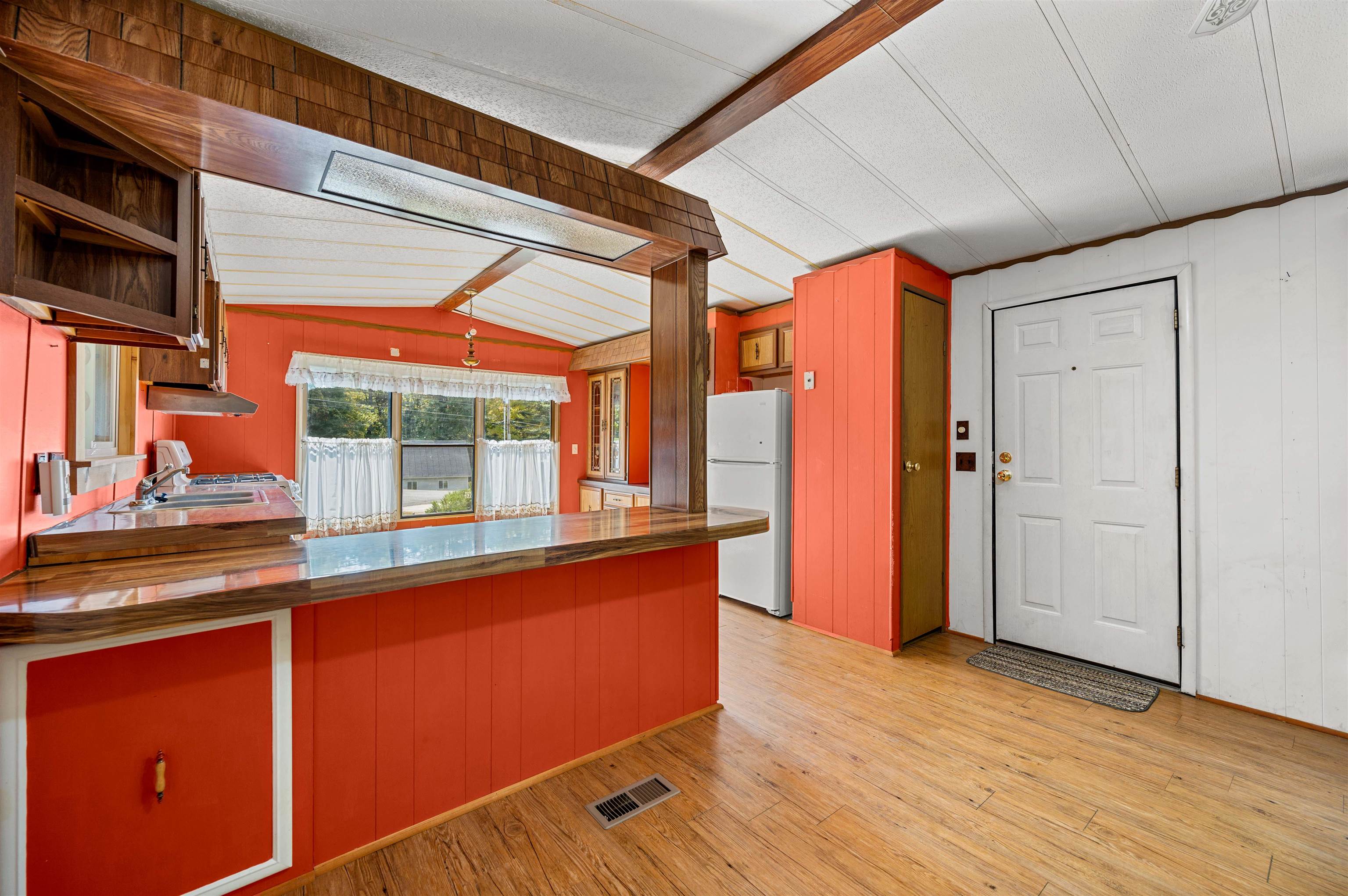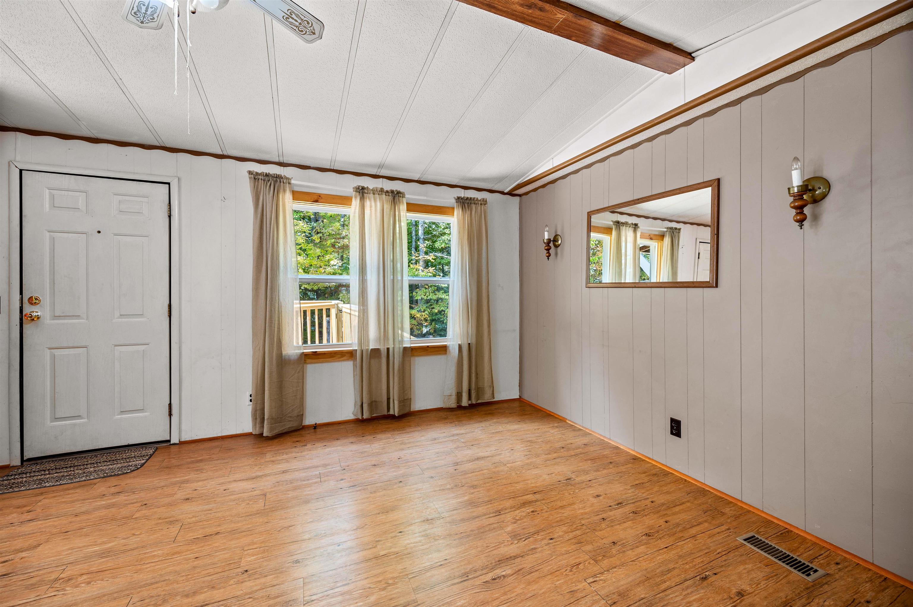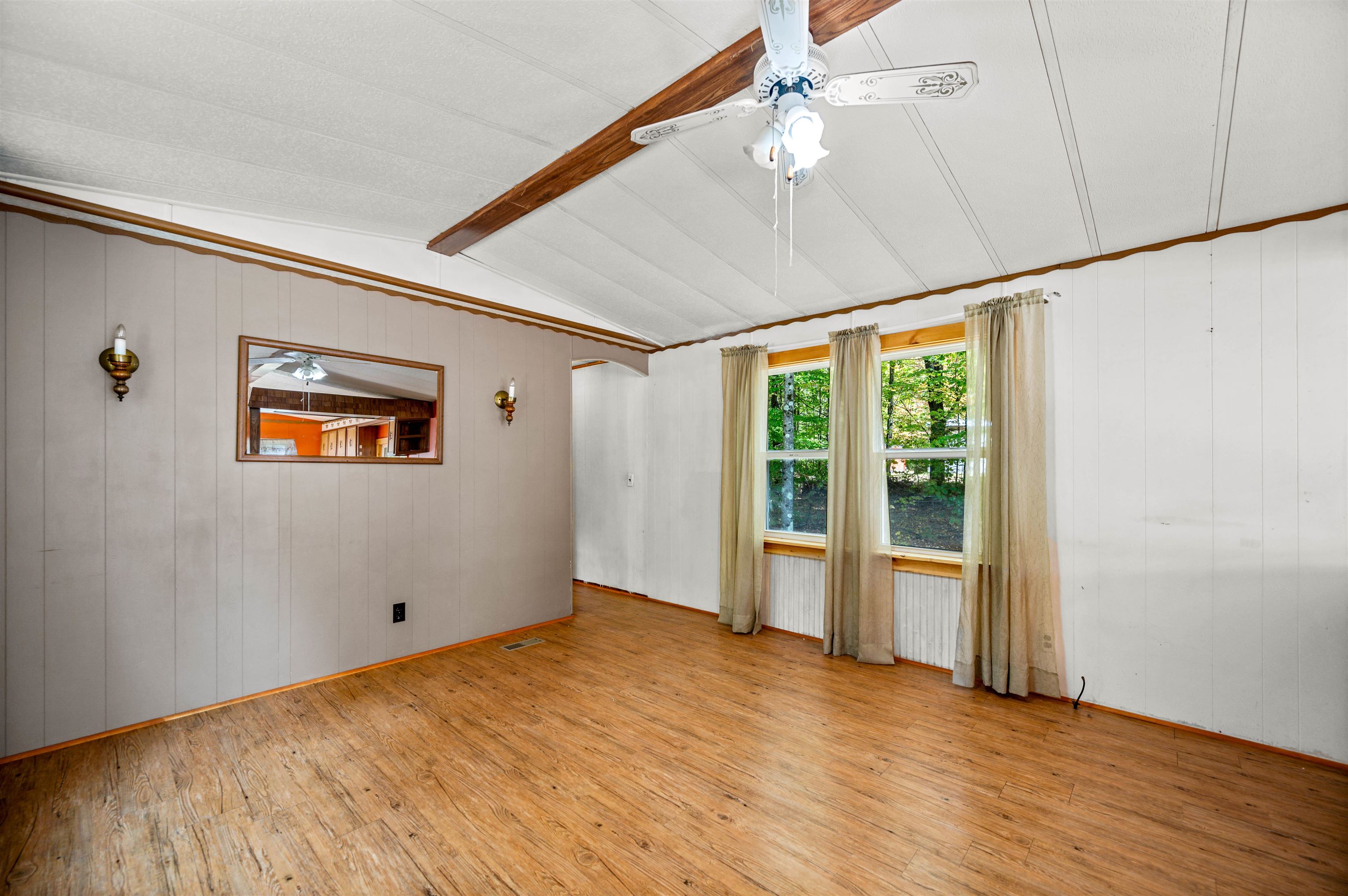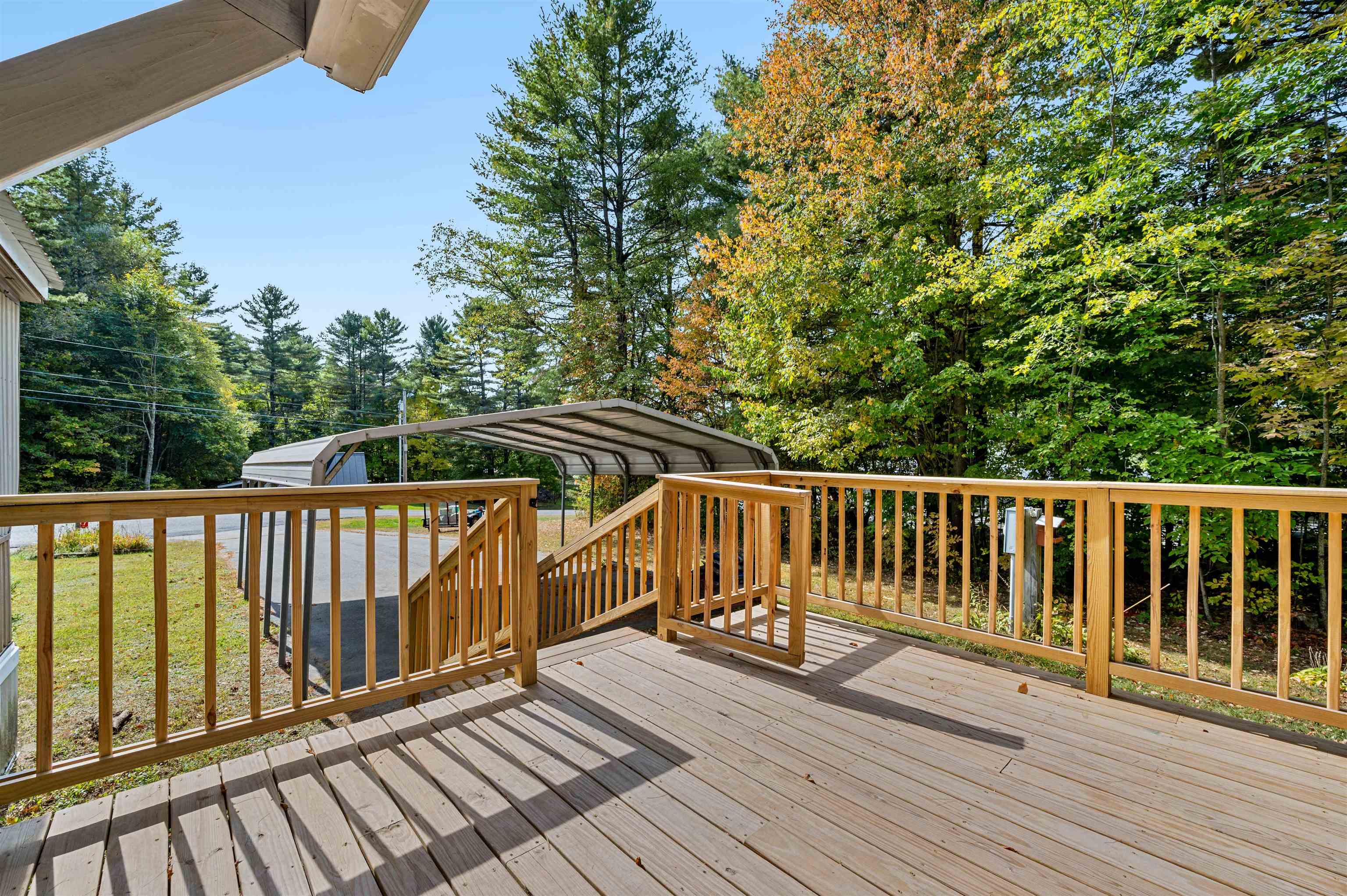 Discover easy living in this two-bedroom singlewide mobile home, situated on a generous 0.91-acre lot at the end of a quiet cul-de-sac. The home features a functional layout including an eat-in kitchen, living room, and a full bathroom with a stand-up shower. The bathroom is conveniently connected to the main living area and the primary bedroom. The layout includes space to easily accommodate the addition of a tub. The exterior boasts a large, level, private yard with a 14x14 deck and two sheds for storage. Enjoy the convenience of town water and sewer, a carport, and a paved driveway. This convenient location is within walking distance to a local store, and close to town recreation fields and the town bike path. A great opportunity for comfortable living with easy access to amenities. Open House 10/4 from 12-2pm.