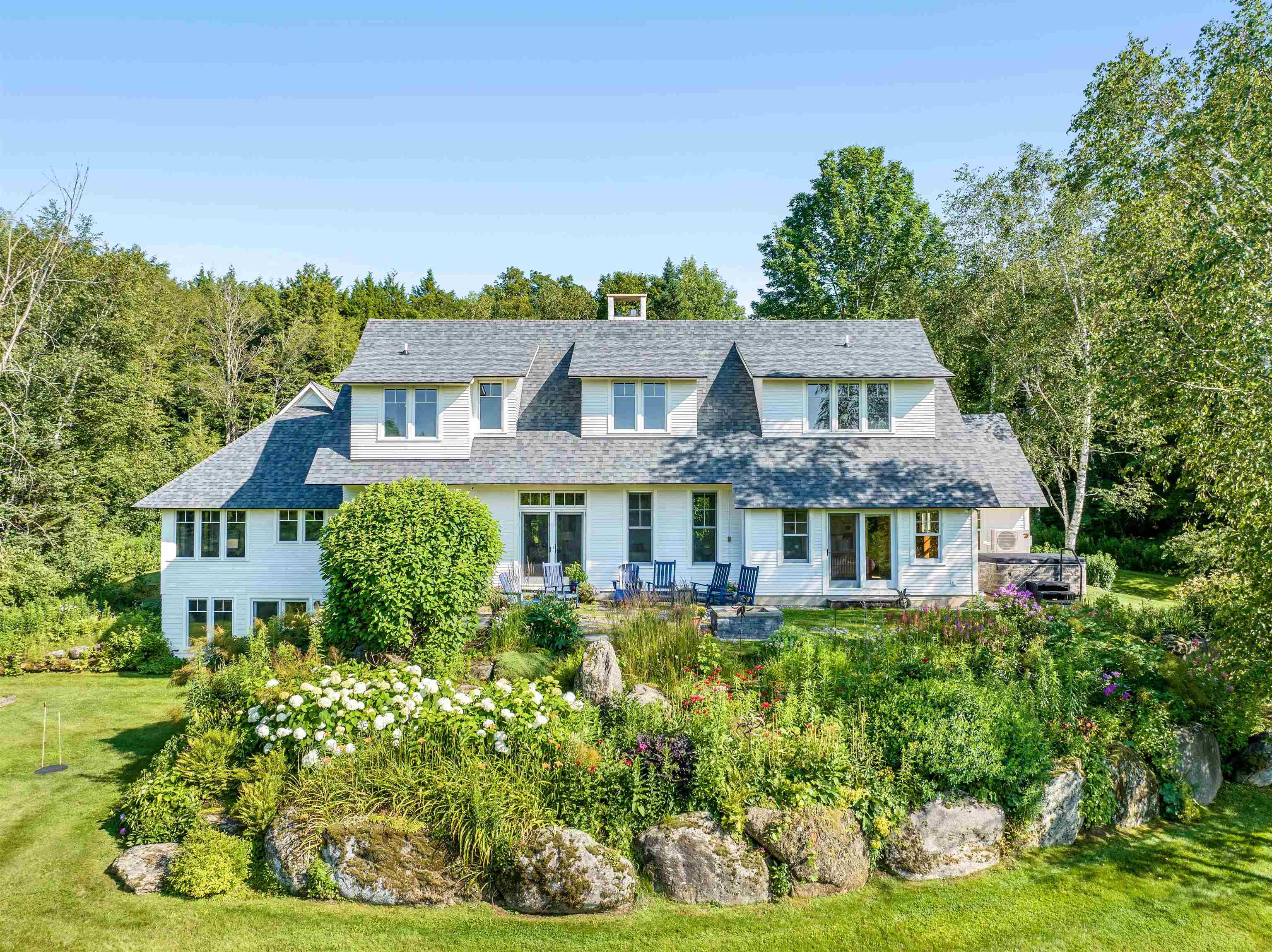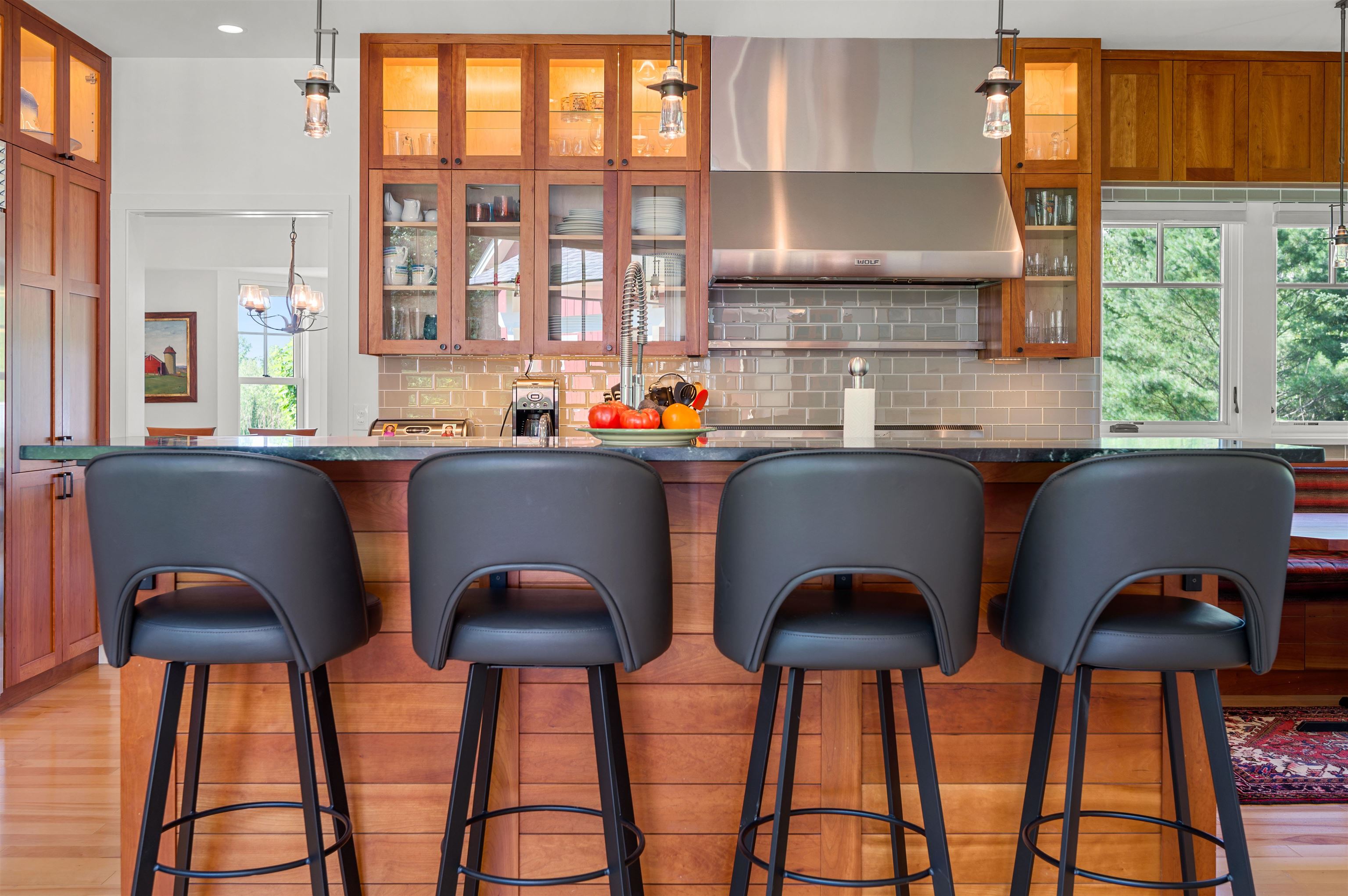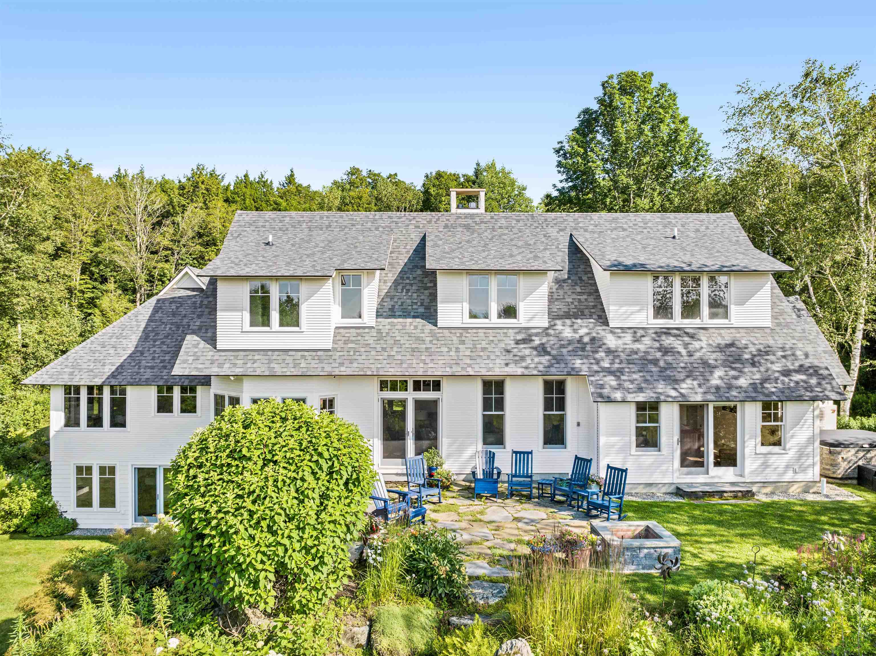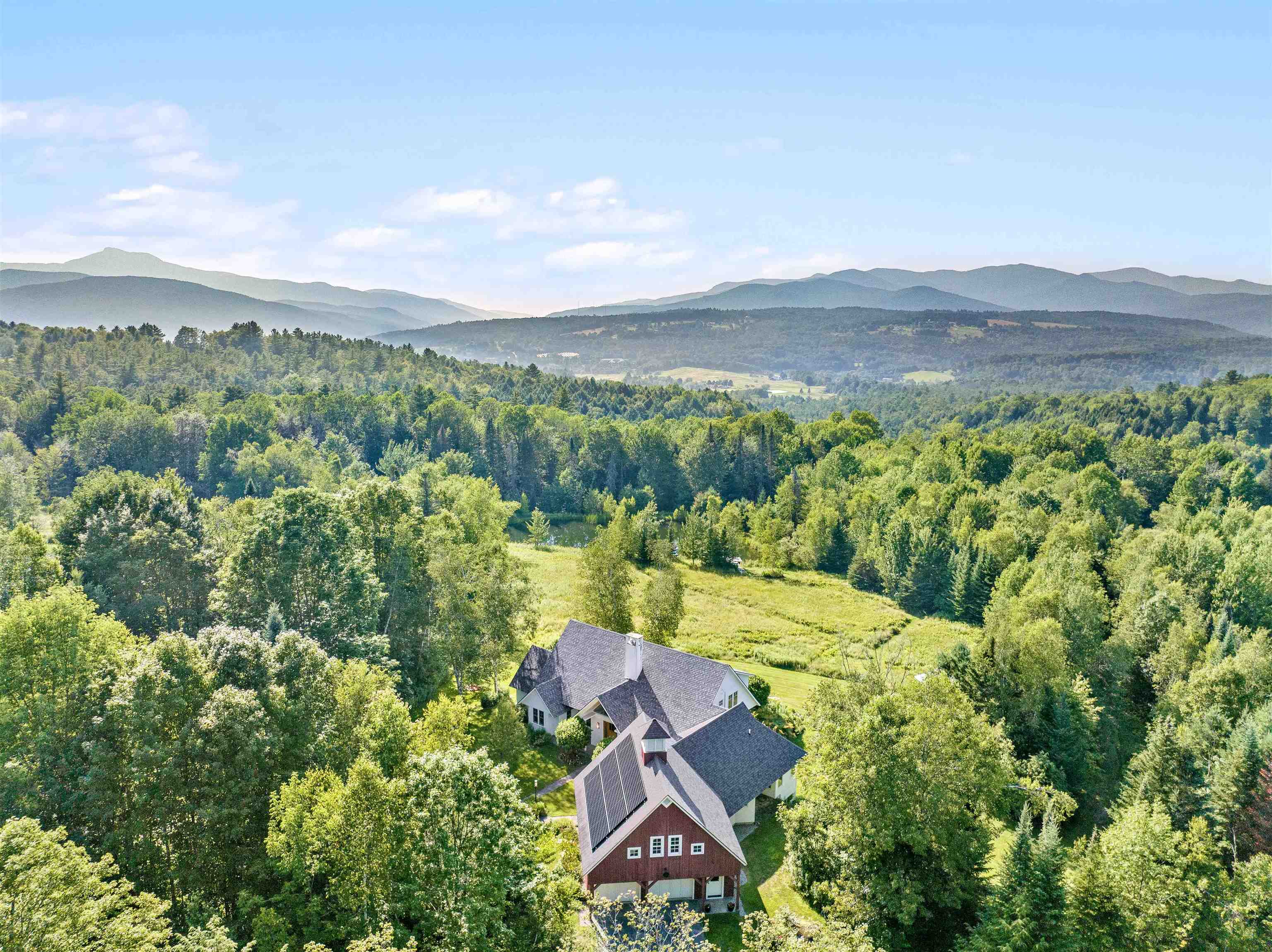This architecturally designed contemporary farmhouse sits on 13.4± acres and combines beautiful craftsmanship with attention to detail, including beautiful views from every window. Situated convenient to Burlington, Stowe and The Mad River Valley, and minutes from Waterbury Village (which in 2024 was featured by The Boston Globe as "the best little foodie town in New England"), this home is located on a secluded private road with mountain views, and a serene environment. The first floor has an elegant entry foyer, living room, dining room, primary bedroom suite, office/bedroom, mudroom replete with a dog shower, powder room and gourmet kitchen with Sub Zero, Wolf and Cove appliances, custom made cherry cabinets, Vermont Verde marble countertops and a separate breakfast nook and den. The second floor includes three bedrooms, two full baths, and spectacular views of both the Mansfield and Worcester mountain ranges. The finished basement has a custom-built office, full bathroom, and a workout room. Both the basement and first floors have radiant heated floors. Outdoor features include extensive landscaping with perennial gardens, stone patios, a hot tub, firepit, swimming pond and a post and beam constructed, standalone tree/playhouse. Energy and heating features include solar panels and heat pumps that provide warmth in the winter and air conditioning during the summer months. This home has it all.