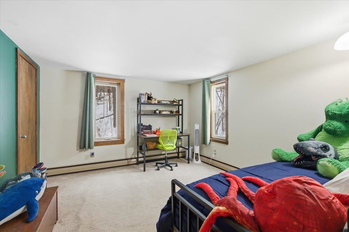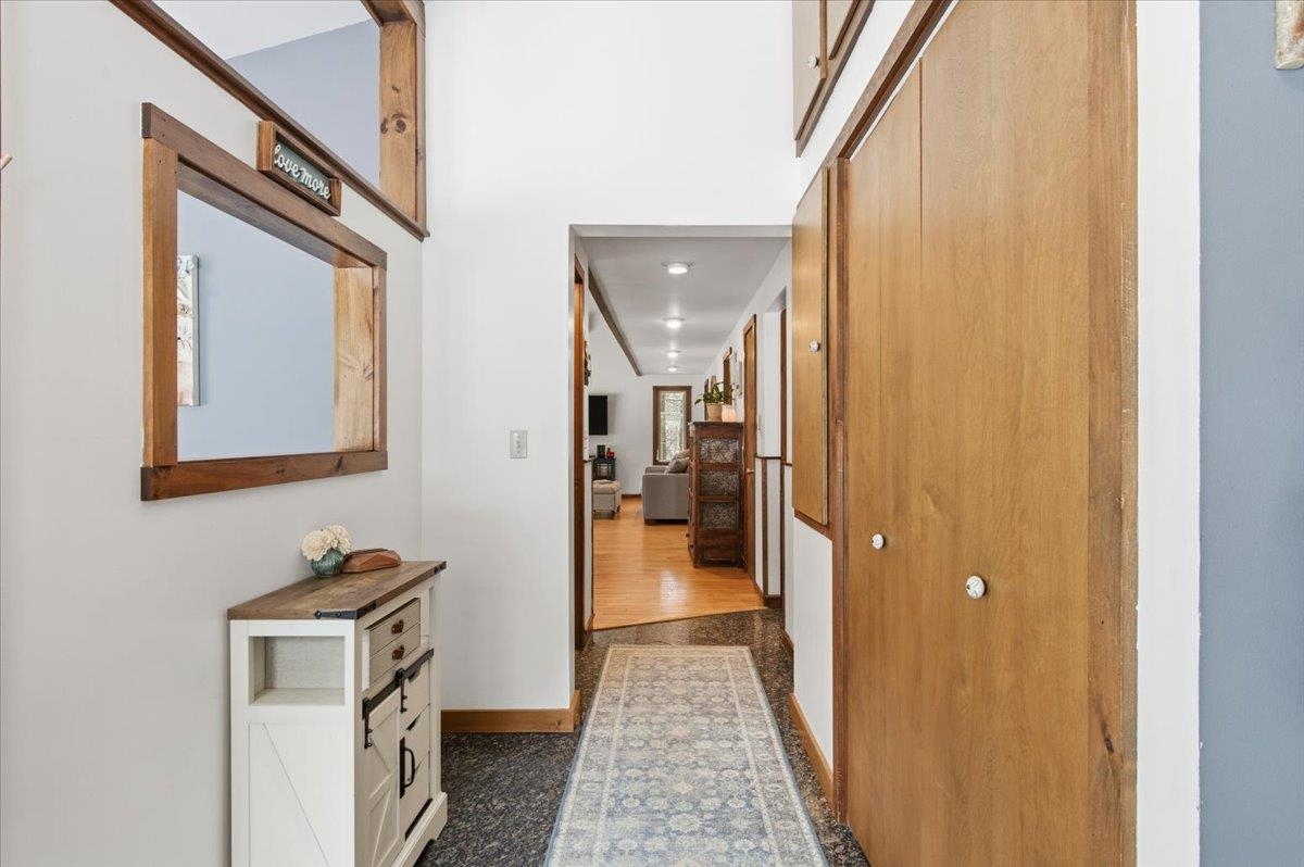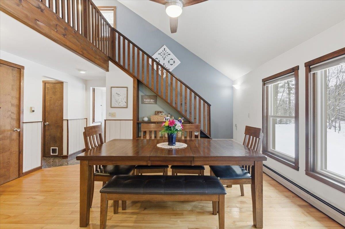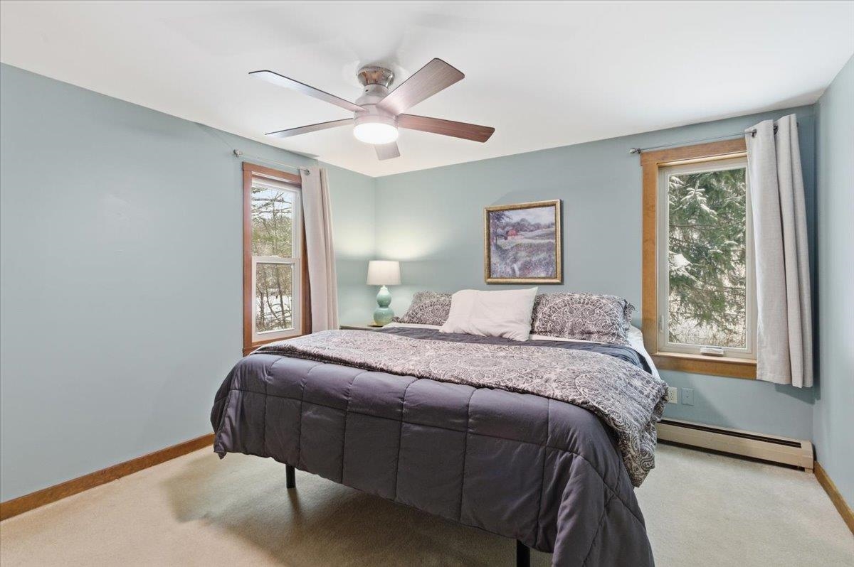 Nestled on a Berlin hillside above Route 12, this 3-bedroom home on 1.6 acres has so much to offer! Enter through a convenient mudroom with a large closet for all your gear. An adjacent sunny room features a sliding door that fills the space with natural light--perfect for a home office, playroom, or a cozy spot to unwind after a day of outdoor adventures. The U-shaped eat-in kitchen has everything at your fingertips, making meal prep and cleanup a breeze. The open living/dining room boasts vaulted ceilings and an easy flow with plenty of windows offering serene wooded views. Just off the living room is the first-floor primary bedroom, complete with a spacious walk-in closet. The large bathroom offers a separate shower and tub, along with a washer and dryer closet for added convenience. Upstairs, an open hallway overlooks the living/dining room and leads to two bedrooms with connecting closets and a full bathroom. The lower level provides abundant storage, a space for exercise equipment, a rec room with a wood stove, and a separate bonus space with a built-in desk. Basement egress is located in the utility room. Exciting updates to the home include a newer dishwasher & fridge, Pella windows throughout, and a whole house Kohler backup generator (2024) with a 10-year warranty. Enjoy outdoor living and relax on the spacious deck off the kitchen, or spend time exploring the nearby wooded trails. Great location, tucked away with plenty of privacy, while still conveniently located close to Montpelier, downtown Berlin & I-89!