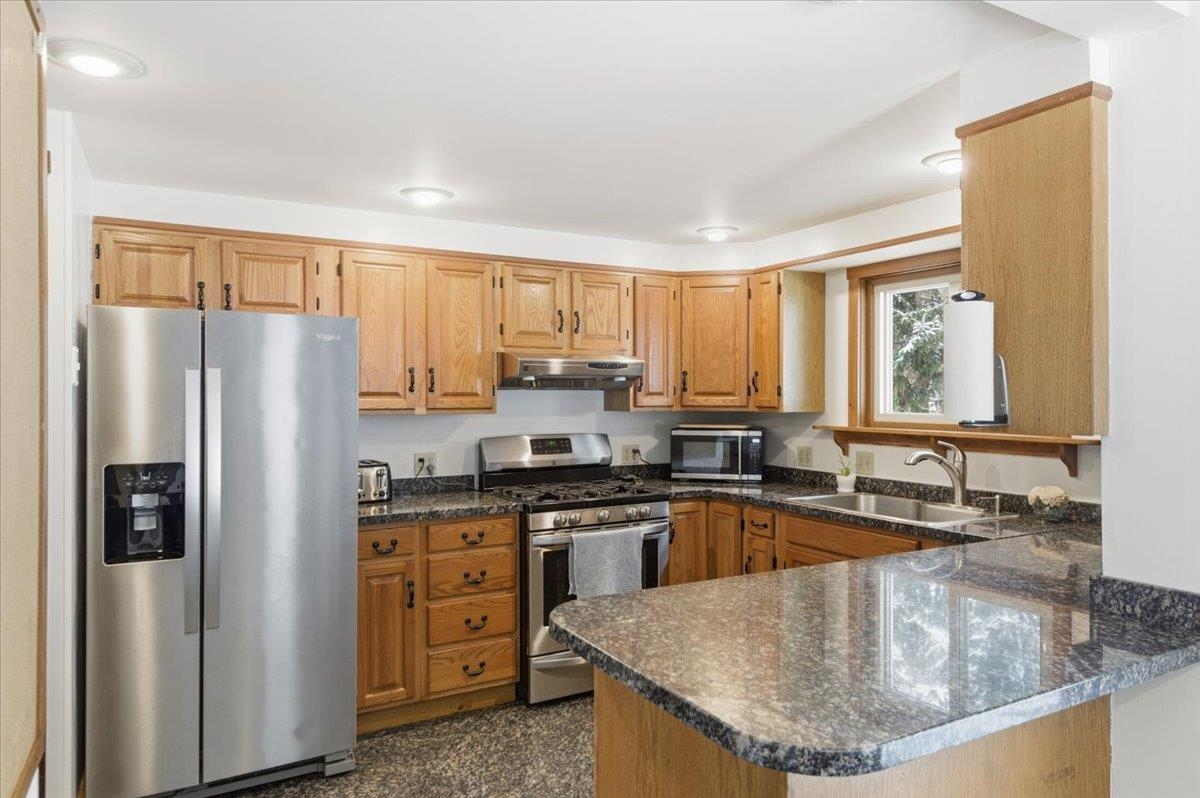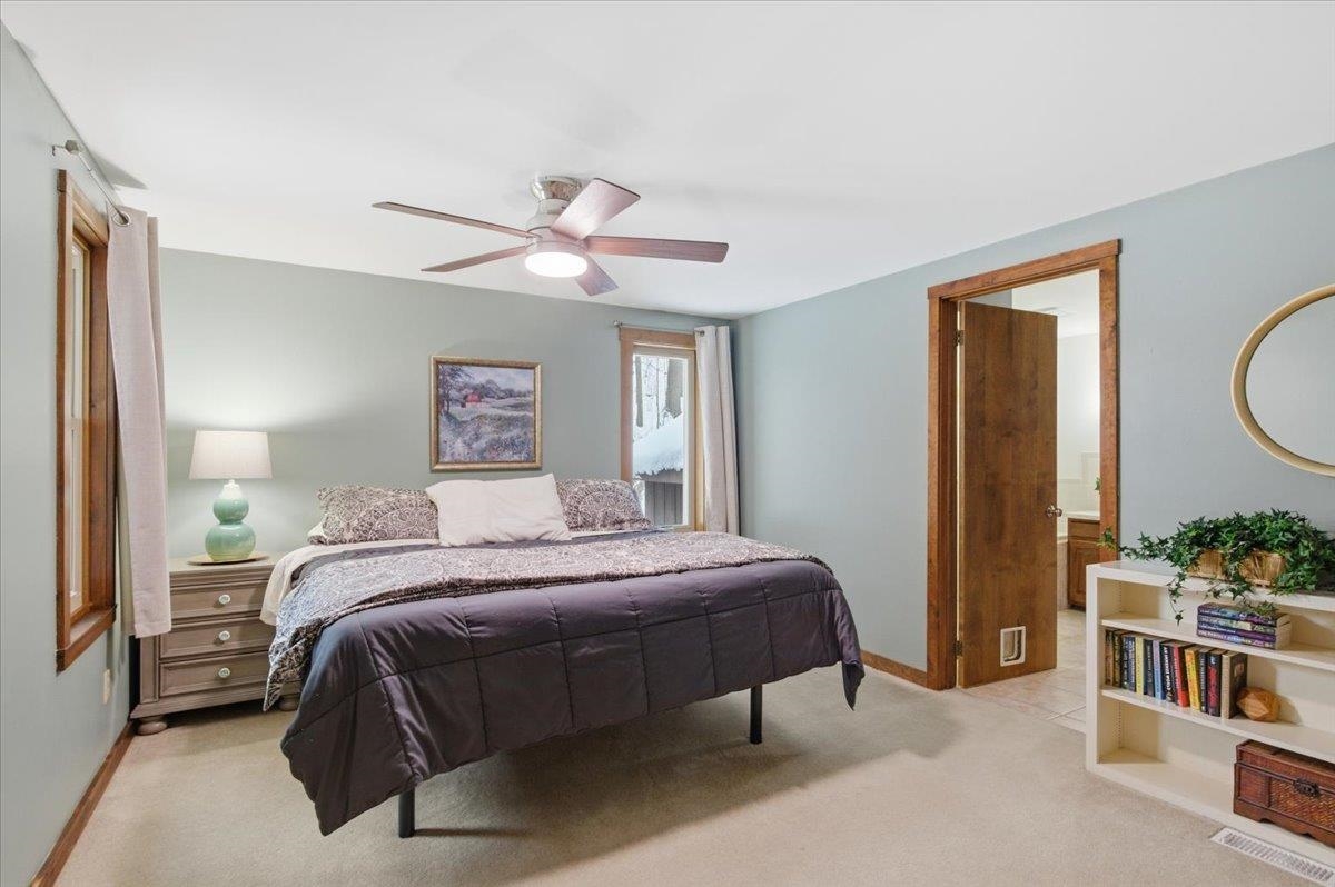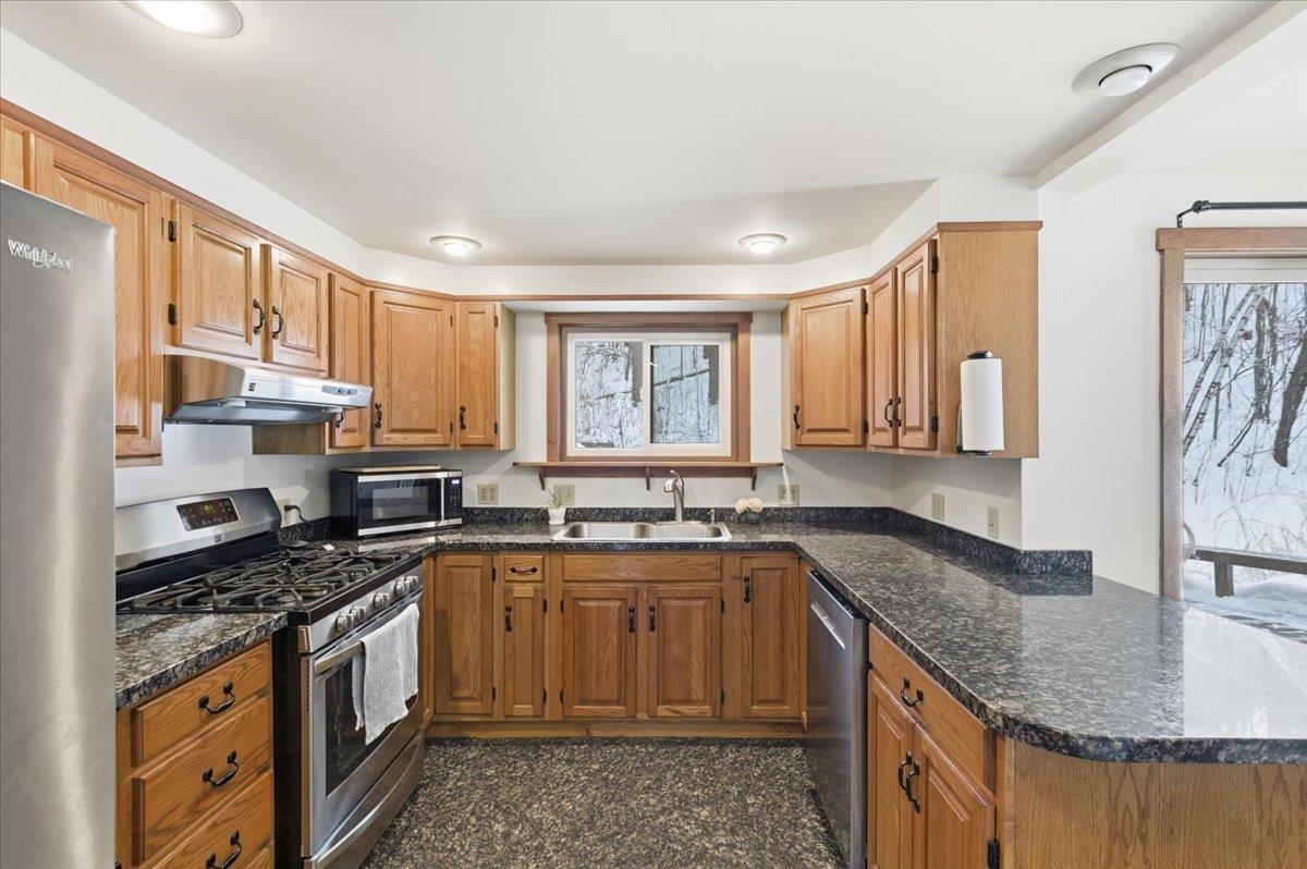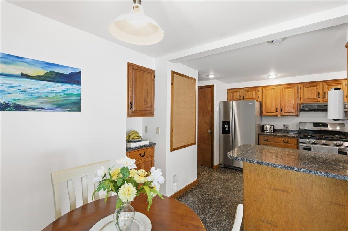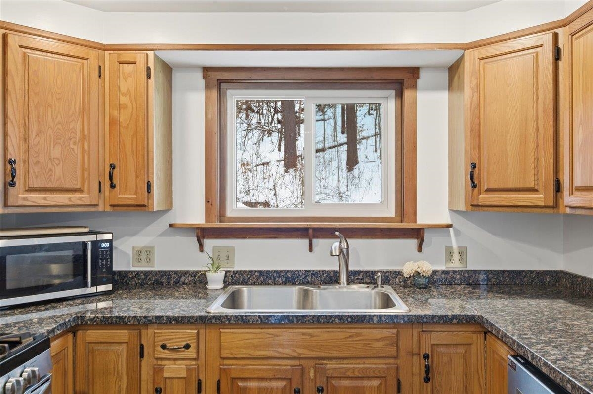 Nestled on a Berlin hillside above Route 12, this 3-bedroom home on 1.6 acres has so much to offer! Enter through a convenient mudroom with a large closet for all your gear. An adjacent sunny room features a sliding door that fills the space with natural light--perfect for a home office, playroom, or a cozy spot to unwind after a day of outdoor adventures. The U-shaped eat-in kitchen has everything at your fingertips, making meal prep and cleanup a breeze. The open living/dining room boasts vaulted ceilings and an easy flow with plenty of windows offering serene wooded views. Just off the living room is the first-floor primary bedroom, complete with a spacious walk-in closet. The large bathroom offers a separate shower and tub, along with a washer and dryer closet for added convenience. Upstairs, an open hallway overlooks the living/dining room and leads to two bedrooms with connecting closets and a full bathroom. The lower level provides abundant storage, a space for exercise equipment, a rec room with a wood stove, and a separate bonus space with a built-in desk. Basement egress is located in the utility room. Exciting updates to the home include a newer dishwasher & fridge, Pella windows throughout, and a whole house Kohler backup generator (2024) with a 10-year warranty. Enjoy outdoor living and relax on the spacious deck off the kitchen, or spend time exploring the nearby wooded trails. Great location, tucked away with plenty of privacy, while still conveniently located close to Montpelier, downtown Berlin & I-89!