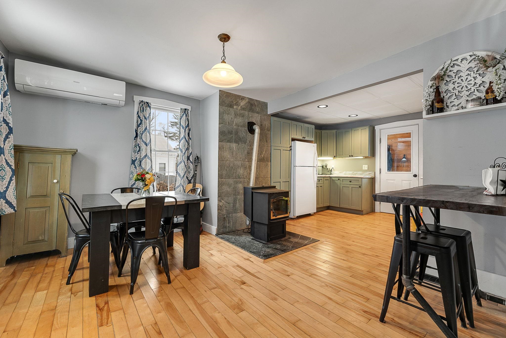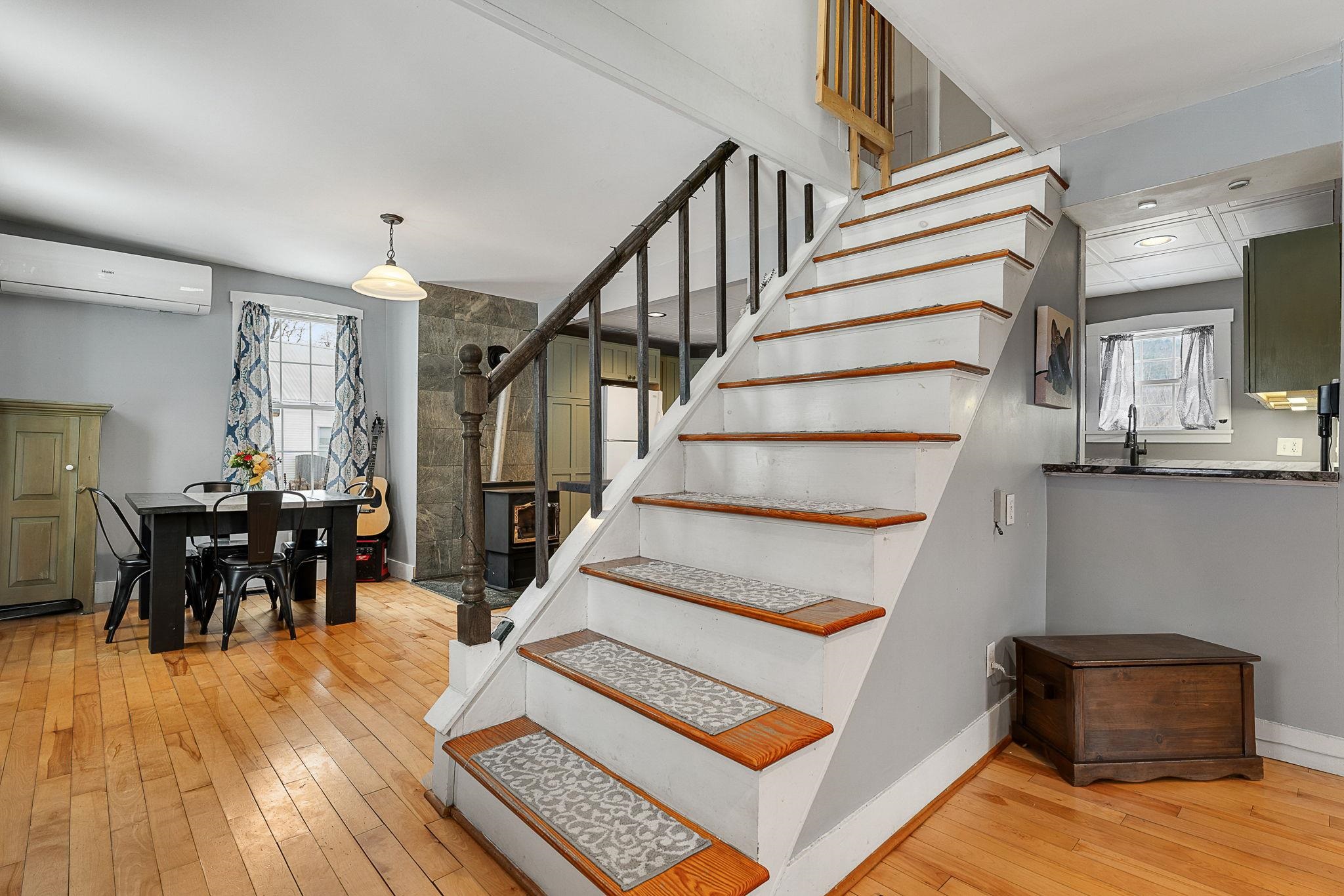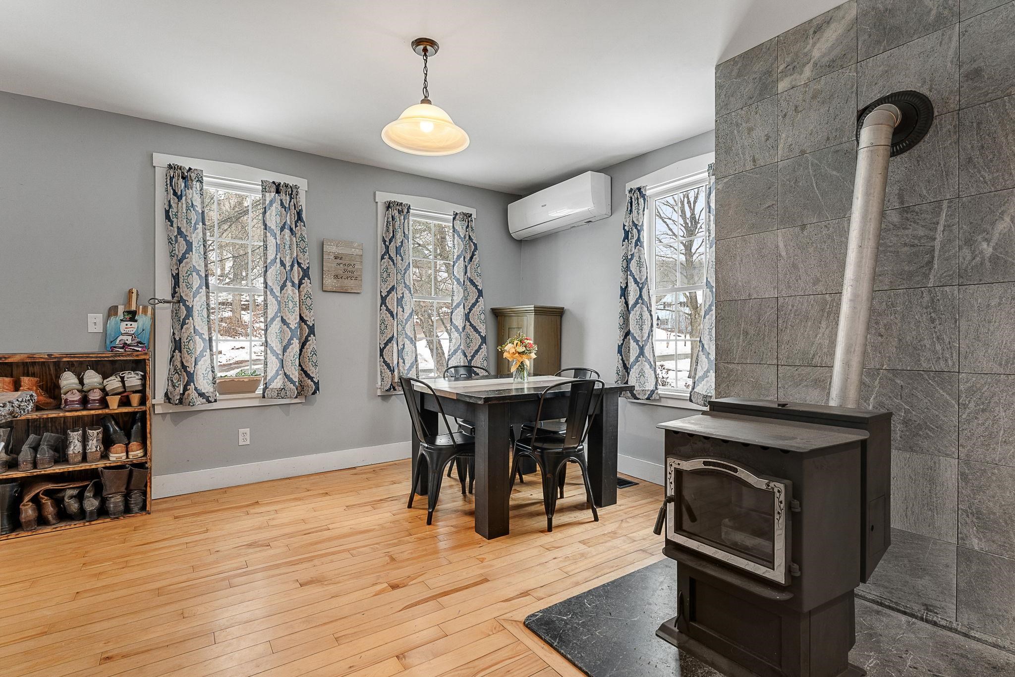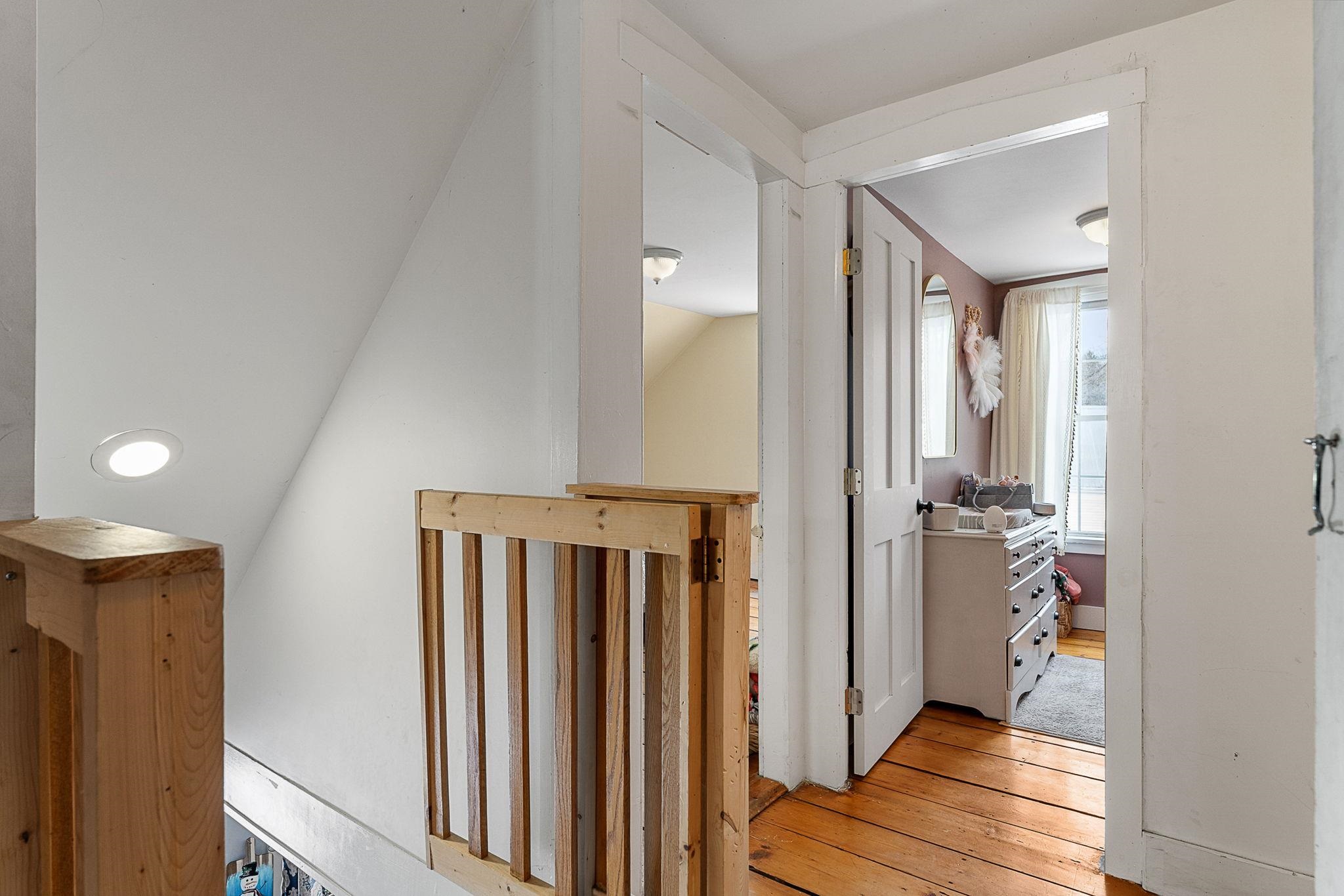 Welcome home! This cozy and classic cape with a huge fenced in yard is ready for its next chapter. Inside you'll find hardwood floors, a comfortable living room, a beautiful country kitchen, first floor laundry and full bath, and a super cozy dining nook with custom bar seating and a beautiful stone hearth. Upstairs are two bedrooms with original pine floors, and the 3rd primary bedroom is super spacious with a great closet to match. The current owners have made many thoughtful updates to the house, including: heat pump on the first floor for heating and cooling, adding a half-bath upstairs for the nighttime, paint, flooring, updated kitchen, updated downstairs bathroom, custom live edge bar, fencing the yard, shed, and more! This property has been well-maintained, convenient to amenities, and is completely move-in ready. Come check it out today!