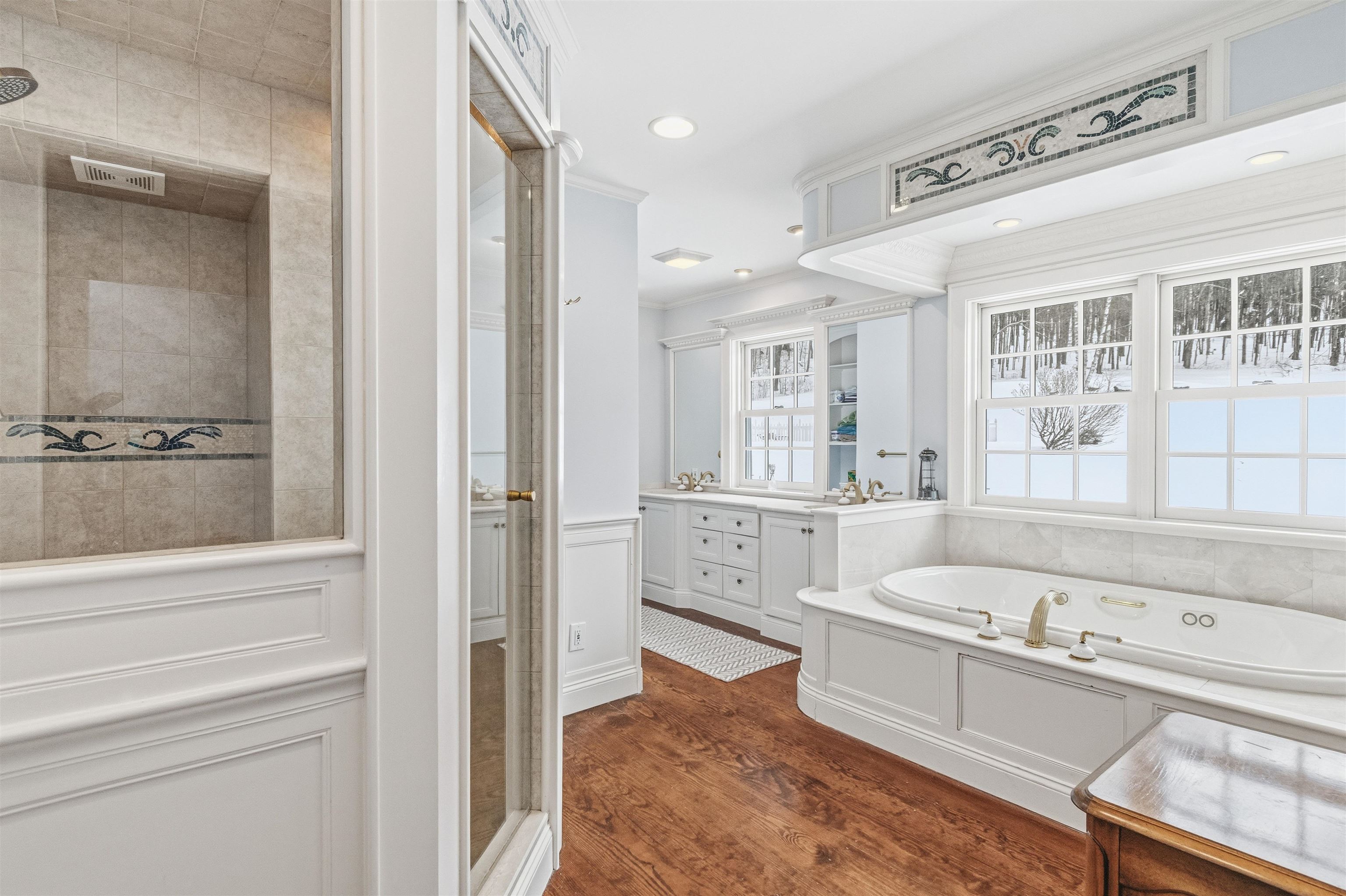 Located two minutes from highly desirable Waterbury Village, this beautifully maintained home on 20+ acres blends luxury, privacy, and convenience. This 4000+ sf, four-bedroom, 3 full bath home checks all the boxes for your primary or home away. A custom-tiled, radiantly-heated great room crowned with cathedral ceilings, skylights, and oversized Pella windows greets visitors with natural light and beautiful views of the surrounding woods. Outfitted for entertaining, the chef's kitchen offers two islands, two ovens and sinks, a gas range, and dual breakfast bars. A hearth area next to the kitchen with a wood-burning fireplace provides a cozy space for warmth and conversation. Hardwood floors run throughout the main living spaces. The main floor boasts a den with a Hearthstone stove and continues into a large family room with an oversized fireplace. A private office adjacent to the living areas provides plenty of space for a work-from-home lifestyle. The first floor finishes with a full bath with a shower and a converted laundry/mudroom area with tons of storage space for ski/snowboard equipment. Upstairs, the master bedroom boasts hardwood floors, a third wood-burning fireplace, two walk-in closets for easy organization, one of which could be reconverted into the fourth bedroom or nursery. The luxurious master bathroom provides a step-in shower and a jetted soaking tub accented with custom mosaic tile trim overlooking wooded property. You'll find an oversized bedroom that flows into a study area, a second bedroom and a full bathroom. At the end of the open hallway lies the large owner's suite with a luxurious master suite. Step outside to a manicured landscape with a wraparound porch leading to a heated in-ground pool, an ideal setting for summer relaxation, alfresco dining, or stargazing. A two-level, two car garage was built recently with unfinished space for future living space or in-law suite. The acreage offers privacy, elevated views, and room to roam.